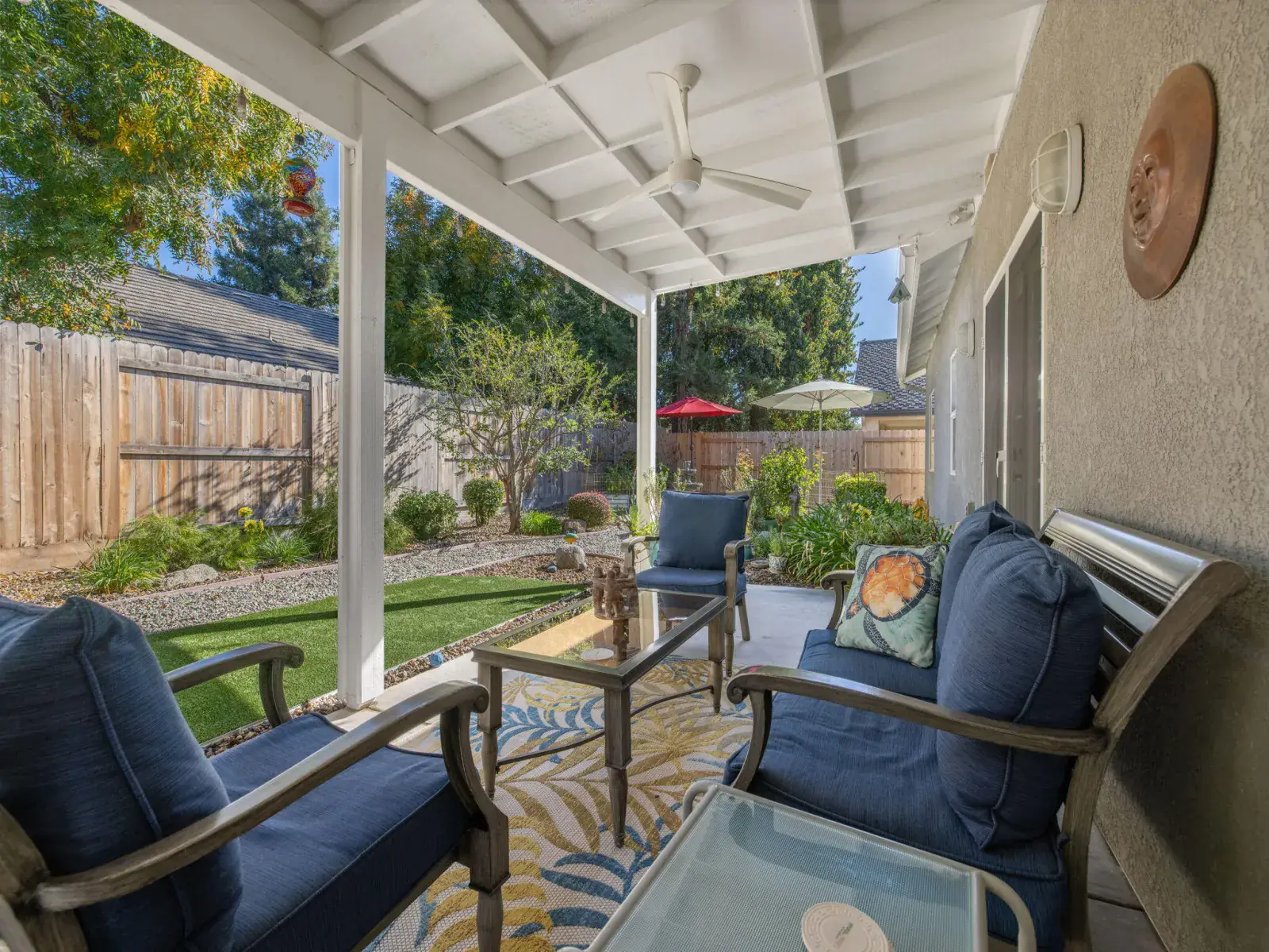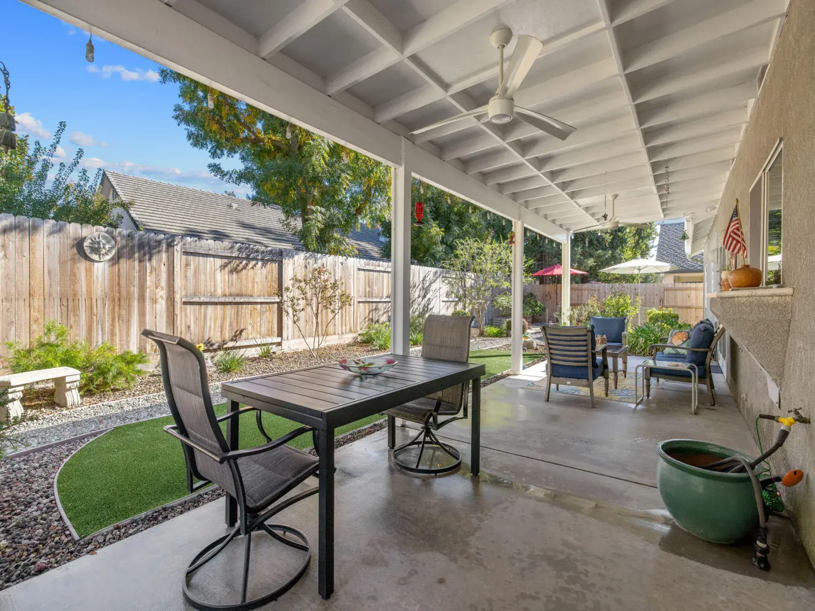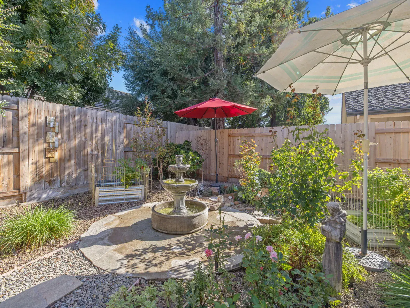 Step outside to your own private oasis — the backyard features beautiful low-maintenance landscaping, custom decorative security gates, a tranquil fountain and waterfall, and multiple seating areas perfect for morning coffee or evening relaxation.