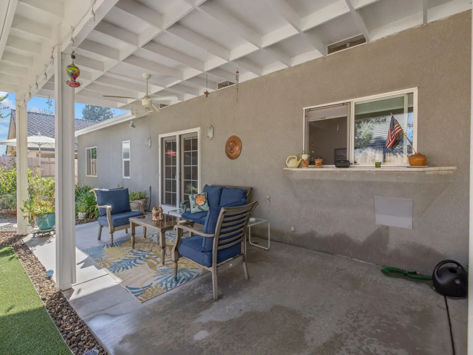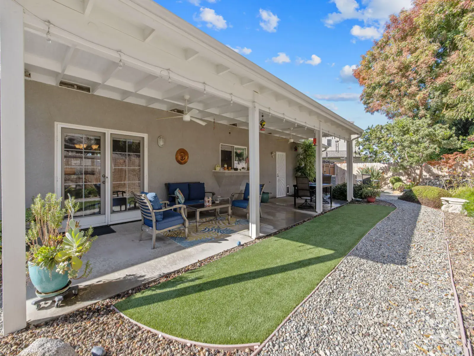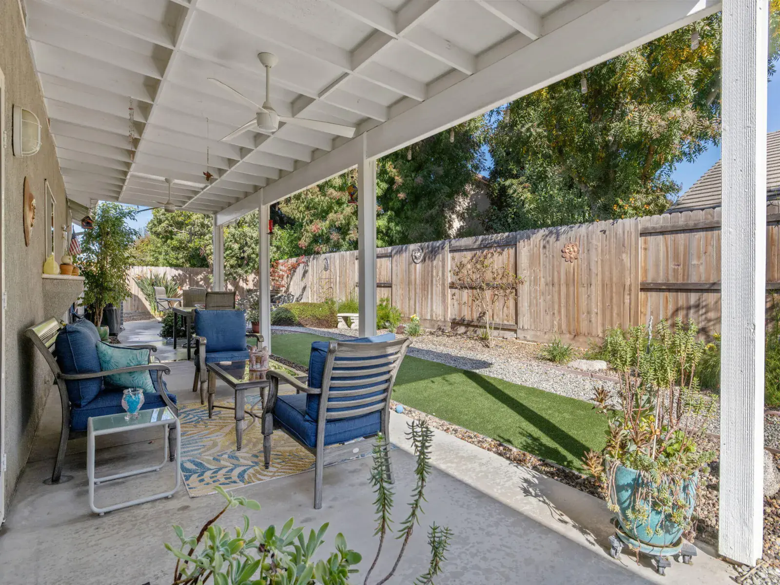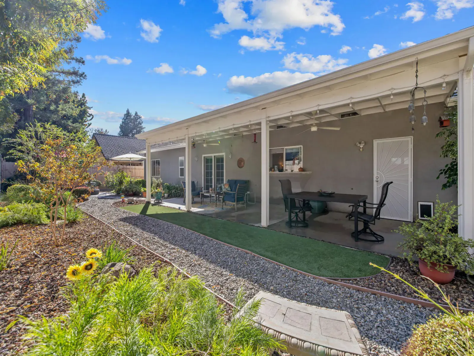 Step outside to your own private oasis — the backyard features beautiful low-maintenance landscaping, custom decorative security gates, a tranquil fountain and waterfall, and multiple seating areas perfect for morning coffee or evening relaxation.