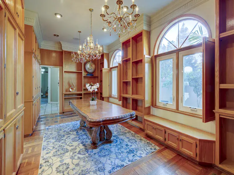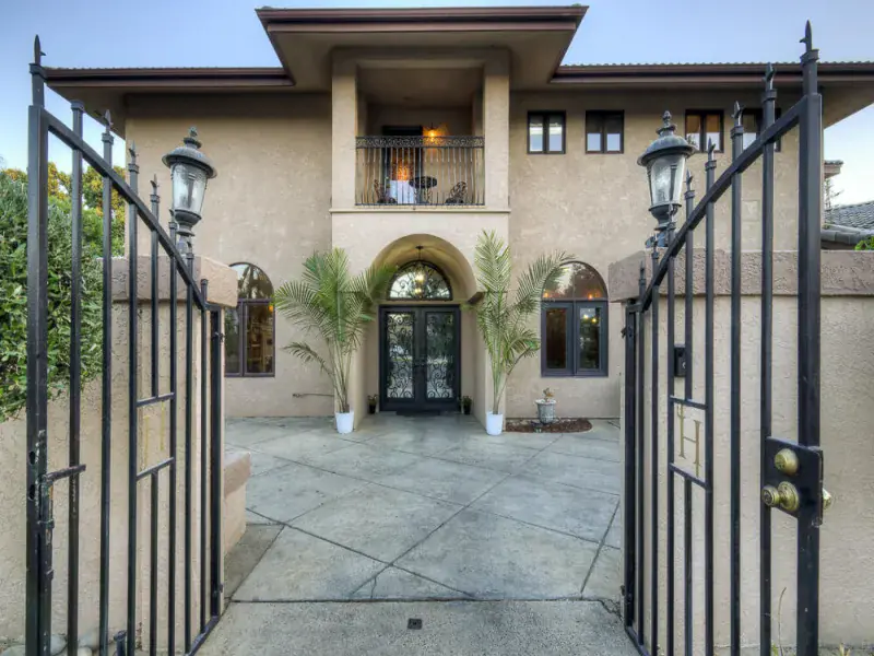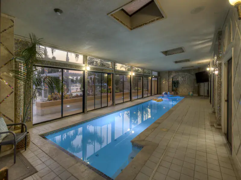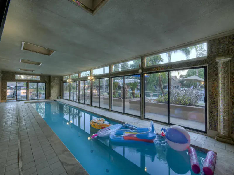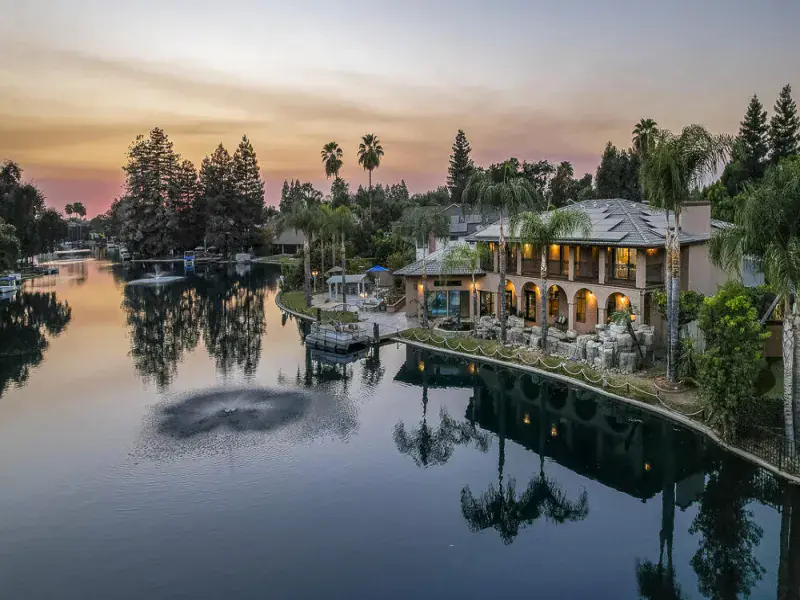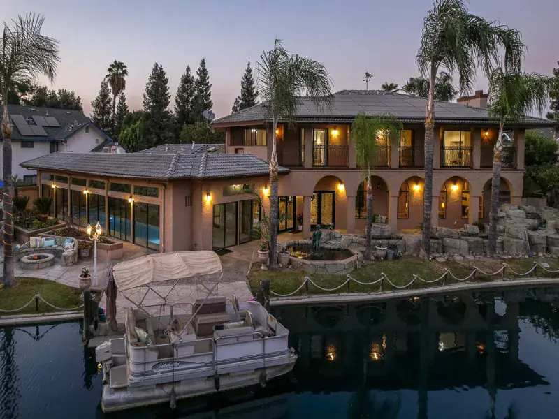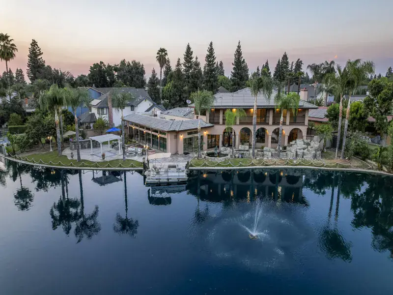 Luxury northwest Visalia living at its BEST! Gorgeous waterfront 5000+ sf 5 bed/5 bath custom home in the prestigious guard-gated community of ”The Lakes” with over 200 feet of waterline, private dock, & indoor pool. One of the biggest lots on the main lake. Breathtaking views of the water & fountains from almost every room w/a double balcony across the back and a first-floor suite w/separate entrance and bonus room for an office, gym, or second TV area. Cruise across the lake or relax on the huge outdoor patio with built-in fire pit, dining table, and outdoor kitchen and bar, perfect for watching the sunset over the water. The heated lap pool is surrounded by glass sliders for year-round swimming. From outside to inside, this home is built for entertaining with an open floor plan across the back from the living room to the kitchen, large wood-paneled formal dining room & living room/office, and an extensive wet bar. The sprawling kitchen is a chef’s dream with tons of granite counter space, an island breakfast bar & dining area, stainless steel appliances including two dishwashers, 5-burner gas cooktop, Subzero fridge, Dacor warming drawer, walk-in pantry, & glass doors onto the pool plus views of the lake. Upstairs – two more bedrooms with attached baths (total of 3 en-suites w/the primary) and two more bedrooms with another bath & dual sinks. Primary suite is an oasis with double doors opening onto a generous bedroom featuring a fireplace, built-ins, & a balcony lake view. Imagine a relaxing bubble bath in the huge jetted tub while watching the fire or TV. Giant walk-in closet, private toilet & shower round out your suite, connected to a large laundry and hobby/makeup room. Front courtyard offers golf cart parking, fruit trees line property, & owned solar. Note: Bed/bath count & square footage differ from tax records. The Lakes has 24-hr security, clubhouses, outdoor pool, tennis. Don’t miss out on your opportunity to make your home feel like vacation living.
