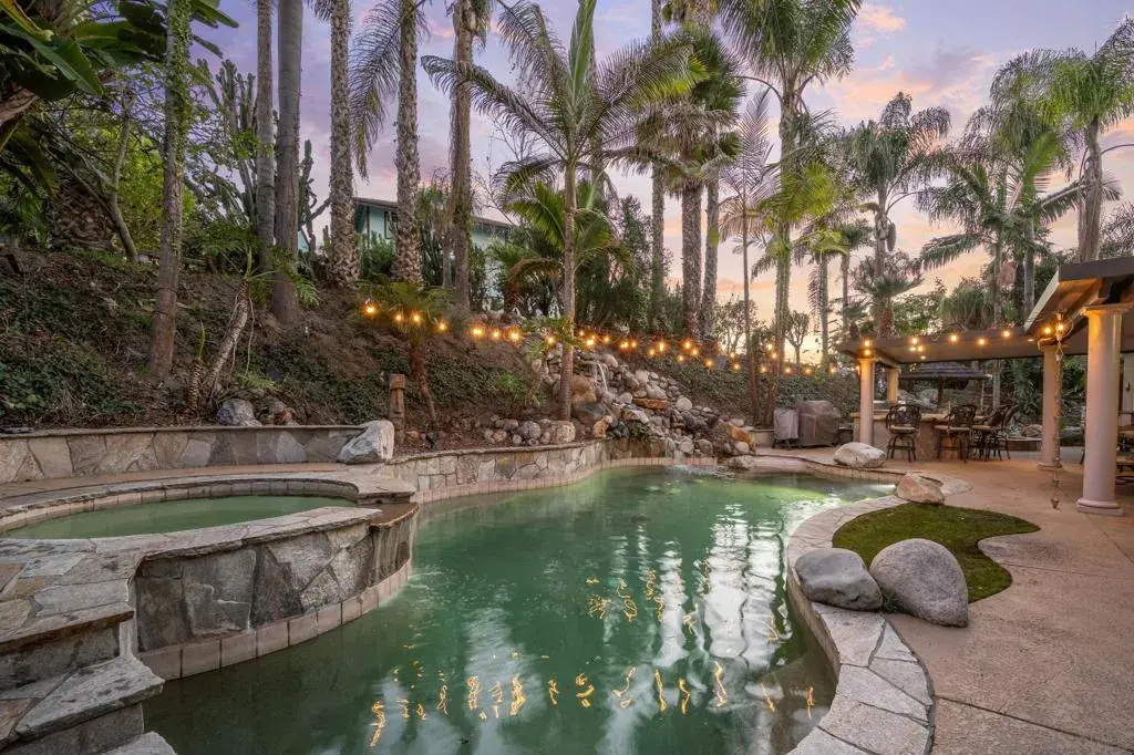 Tucked away on a private cul-de-sac, this extraordinary 3,943 sq. ft. custom estate in Vista captures the essence of luxury Southern California living. Set on over half an acre with room for an ADU and elevated panoramic views, the home’s refined design features travertine and hardwood flooring, a chef’s kitchen with Wolf range and hood, a whole-stone granite sink, and rich granite slab counters. Entertain in style with a dedicated wine room, elegant fireplaces, and a private music studio with full bath above the garage(could be another huge bedroom). The expansive primary suite offers a walk-in closet and peaceful garden views. Outdoors, enjoy a resort-inspired setting with a sparkling pool and spa, two cascading waterfalls, fire pit, koi pond with bridge, and lush fruit trees including apple, lemon, lime, tangerine, blueberry, and grape. Pig pit and garden areas with bird aviary top the lot off. Over 800 sqft. of covered space hosts a full granite outdoor kitchen, grill, ovens, bar seating, and lounge areas amid stunning landscaped grounds.