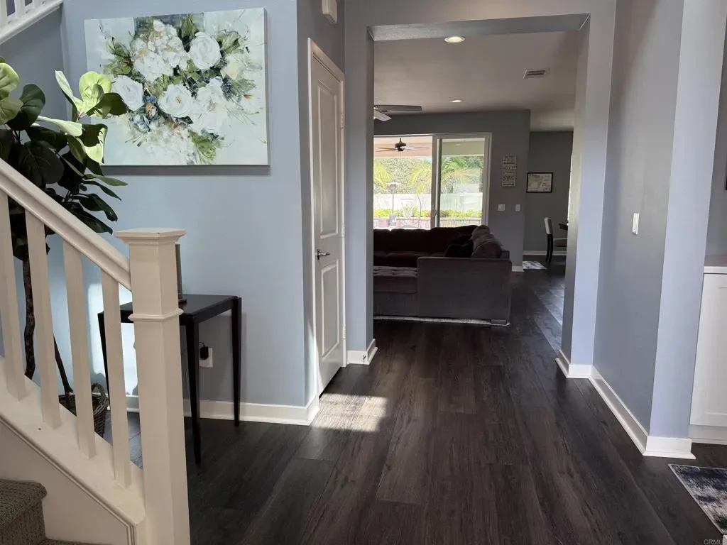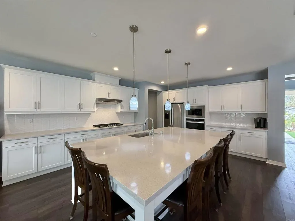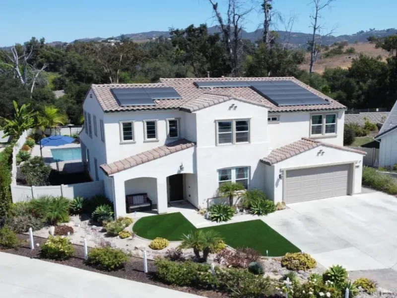 Nestled within the prestigious gated community of Oak Creek, this exquisite California modern mission-style residence offers a rare fusion of refined elegance and tranquil natural beauty. Set against a backdrop of rolling hills and lush greenery in North San Diego County, the home embodies a seamless balance between serene retreat and connected convenience. Thoughtfully designed and meticulously upgraded, the residence features 6 spacious bedrooms and 4 bathrooms, including en-suite accommodations on both levels—ideal for multigenerational living or hosting guests in comfort and privacy. The primary suite serves as a true sanctuary, complete with sweeping views, a spa-inspired soaking tub, and expansive walk-in closet space. At the heart of the home, a chef’s kitchen dazzles with a grand center island, walk-in pantry, and premium finishes, flowing effortlessly into an open-concept living space defined by abundant natural light. Every detail has been curated for both everyday living and elevated entertaining, including a dedicated laundry room and modern energy-efficient enhancements such as solar power and EV charging. Step outside to an entertainer’s paradise, where a covered patio, spa with a waterfall leading to a luxurious saltwater pool, ambient fire pit, and fully equipped outdoor kitchen create an inviting atmosphere for gatherings. The beautifully landscaped grounds—adorned with mature fruit trees and manicured greenery—frame breathtaking views of the Vista preserve and surrounding foothills. Perfectly positioned for both convenience and lifestyle, the home offers easy access to major highways while remaining just moments from the charm of downtown Vista, premier golf courses, scenic parks, vibrant shopping and dining, and the beautiful beaches of the Southern California coast. A true sanctuary where luxury, nature, and lifestyle converge.