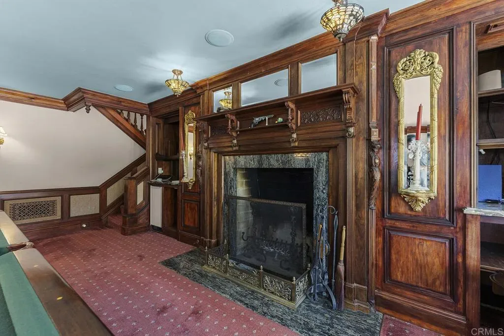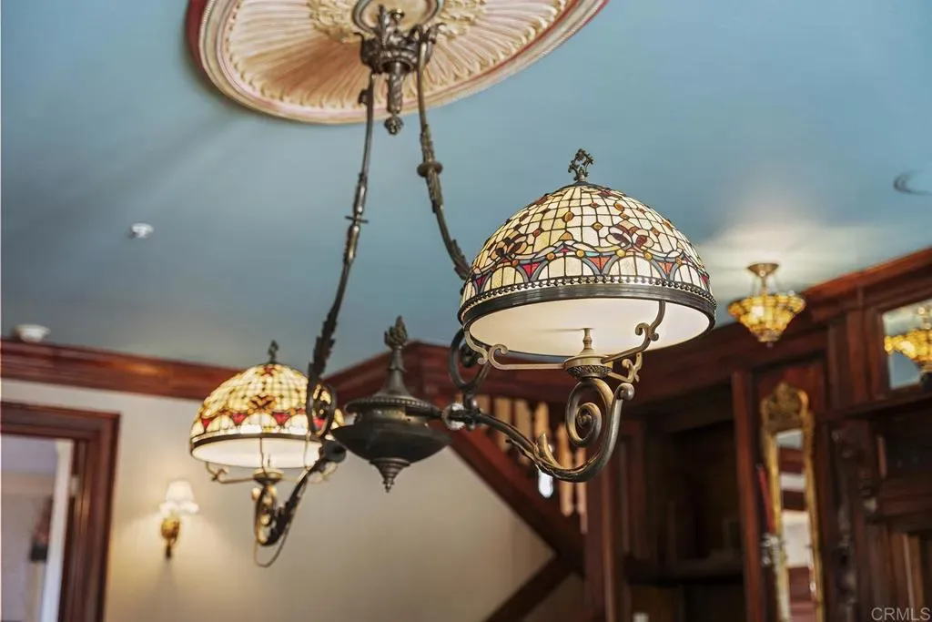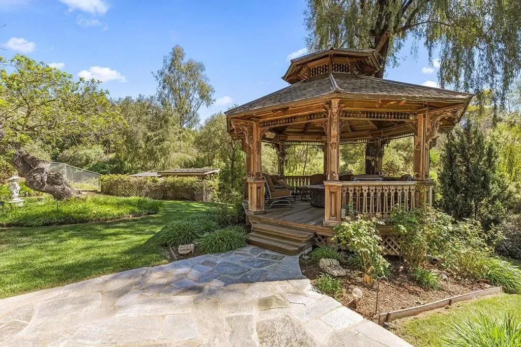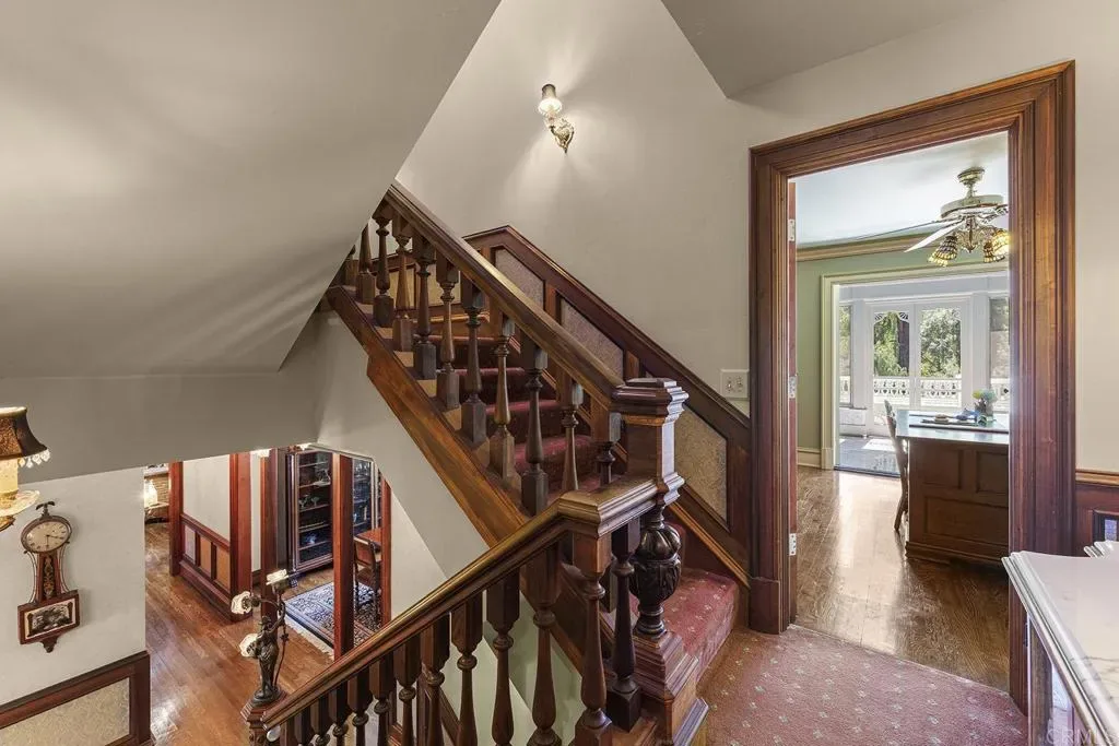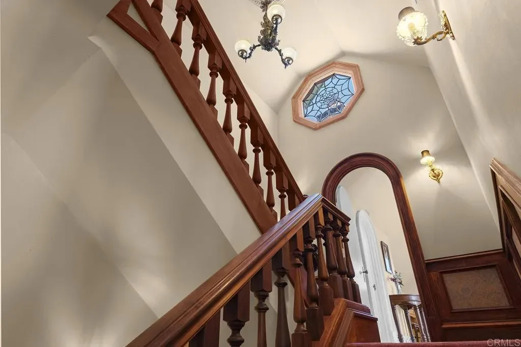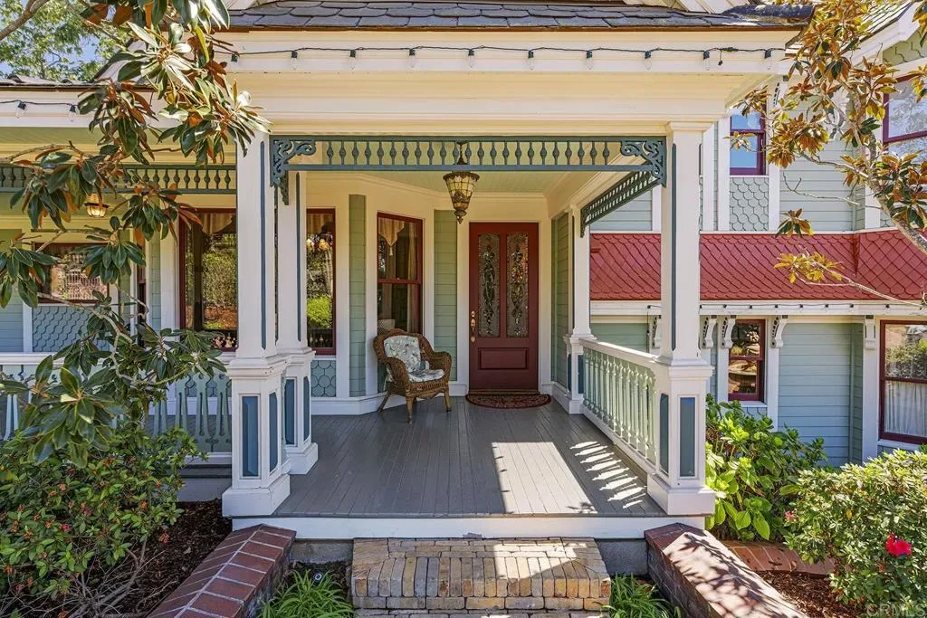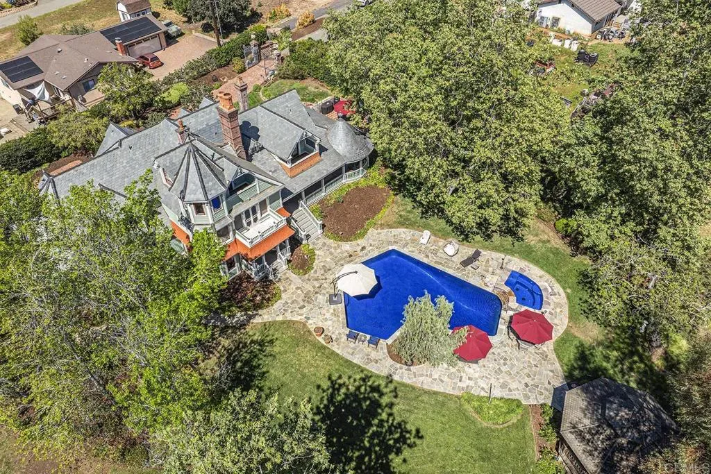 Looking for a quiet respite? This one-of-a-kind Queen Anne Victorian estate blends timeless architecture with modern comfort on over an acre of private, usable land in Vista’s desirable Warmlands. Custom-built by a Rancho Santa Fe master builder, the home showcases exceptional craftsmanship and attention to detail throughout. It features four ensuite bedrooms, each on its own level, with sitting areas, walk-in closets, and private baths. Three bedrooms offer private balconies overlooking the grounds, while the expansive primary suite includes a study, dressing room, spa-like bath, and distinctive architectural elements such as a turret, leaded glass windows, and a classic Victorian sleeping porch. From the 160-year-old iron entry gates to the hand-cut slate roof and hand-laid brick driveway, the property is rich with character. Antique lighting and hardware sourced from an 1850s Chicago hotel further enhance its authenticity. The main living spaces are both inviting and functional, offering a formal parlor, a billiards room with wet bar and fireplace, and kitchen featuring vintage-style appliances, a Sub-Zero built-in refrigerator, and French doors that open to the veranda. Designed for seamless indoor-outdoor living, the wrap-around covered veranda provides multiple seating areas, built-in speakers, and peaceful views of the surrounding landscape. The grounds include a mosaic-tiled saltwater pool and spa finished with beautiful sparkling Colorado Silverstone, a gazebo with fire pit, built-in BBQ, lush gardens, and a variety of mature fruit trees. A seasonal creek bed along the rear of the property enhances privacy, with open space and agricultural land beyond. Additional features include fully owned solar with battery backup and a Tesla charger. The lower portion of the property offers space for a future guest house or ADU, workshop, or sport court. Ideally located with convenient access to the 76 Freeway, this exceptional estate offers a rare combination of privacy, craftsmanship, and storybook charm.