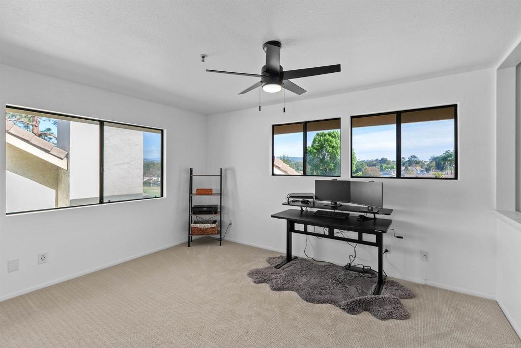 Perched above the 2nd hole of the Shadowridge Golf Course, this beautifully updated 4 bedroom home offers sweeping golf course views from nearly every room in the house. Featuring 2,224 sq ft of open-concept living, the functional floor plan lives like a single-story home with a convenient first-floor primary suite. As you enter through the gated courtyard, you are greeted by a custom, glass front door which showcases the spectacular views of the golf course before you even enter the home. Once inside, the remodeled kitchen is thoughtfully designed with quartz countertops, soft-close cabinetry, a 5-burner Bertazzoni gas range, single bowl farmhouse-style sink, and newer LG appliances including refrigerator, dishwasher, microwave and separate warming drawer. The spacious dining room features vaulted ceilings with a gorgeous 12 ft cluster pendant. The living room is highlighted by a modern fireplace with custom tile surround and a built-in 65″ TV – perfect for relaxing or entertaining. Downstairs boasts bamboo flooring throughout, with newer carpet in the upstairs loft and 3 guest bedrooms. Additional features include air conditioning, upgraded lighting, a newer water heater, and freshly painted interior. Step outside to a low-maintenance backyard where you can enjoy your morning coffee or afternoon tea while taking in the views of the tranquil golf course setting. The Sunrise community offers fantastic amenities including a community pool and spa with HOA-covered front yard landscaping and common area maintenance. With quick access to the 78 freeway, this home is located approx. 8 miles from the beach and is within close proximity to shops, restaurants, schools, and of course the beautiful Shadowridge golf course. Nature lovers will appreciate being about 1 mile from Buena Vista Park Pond & Open Space where you can feed the ducks, walk the dog, or enjoy the scenic hiking trails. This home offers the perfect blend of comfort, convenience, and community. Don’t miss out, schedule your private showing today!