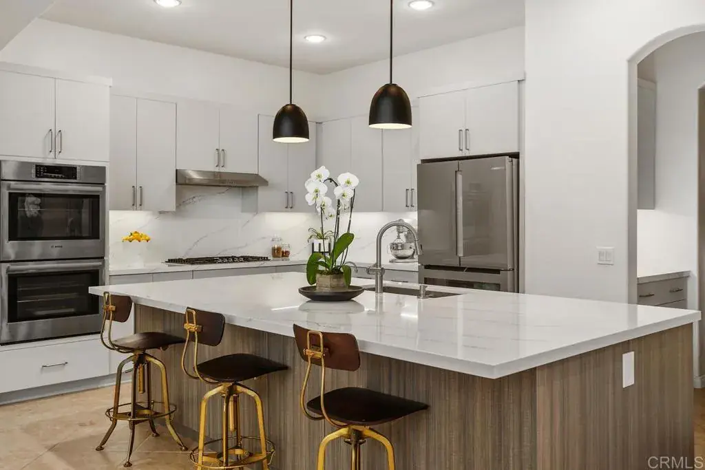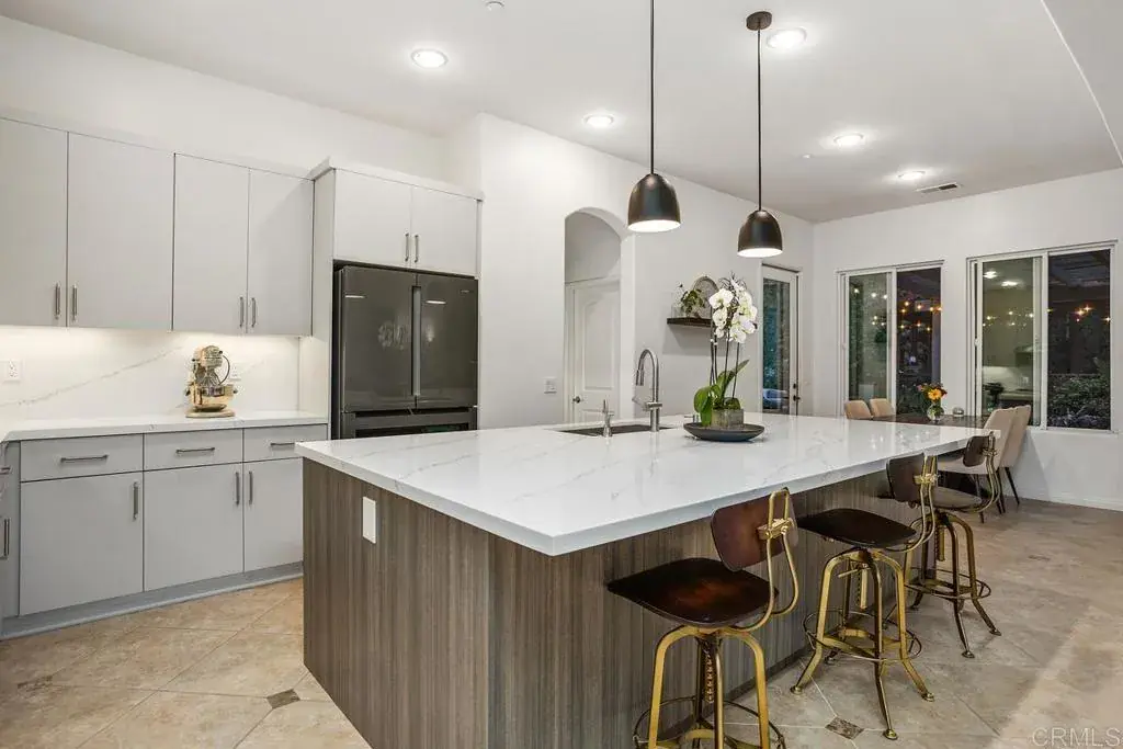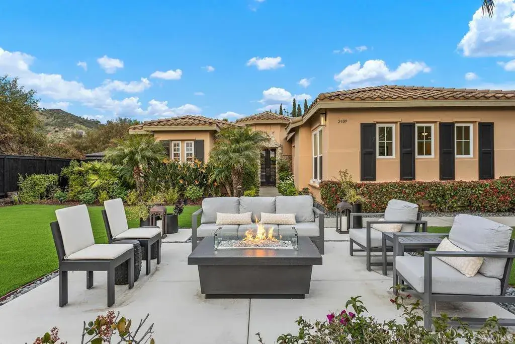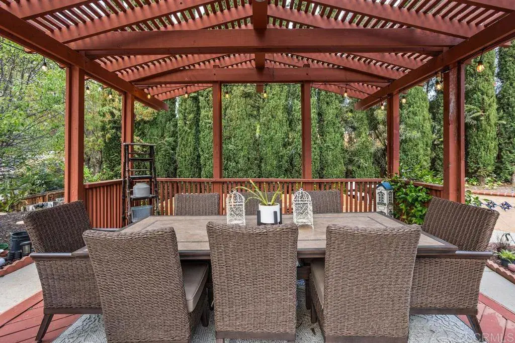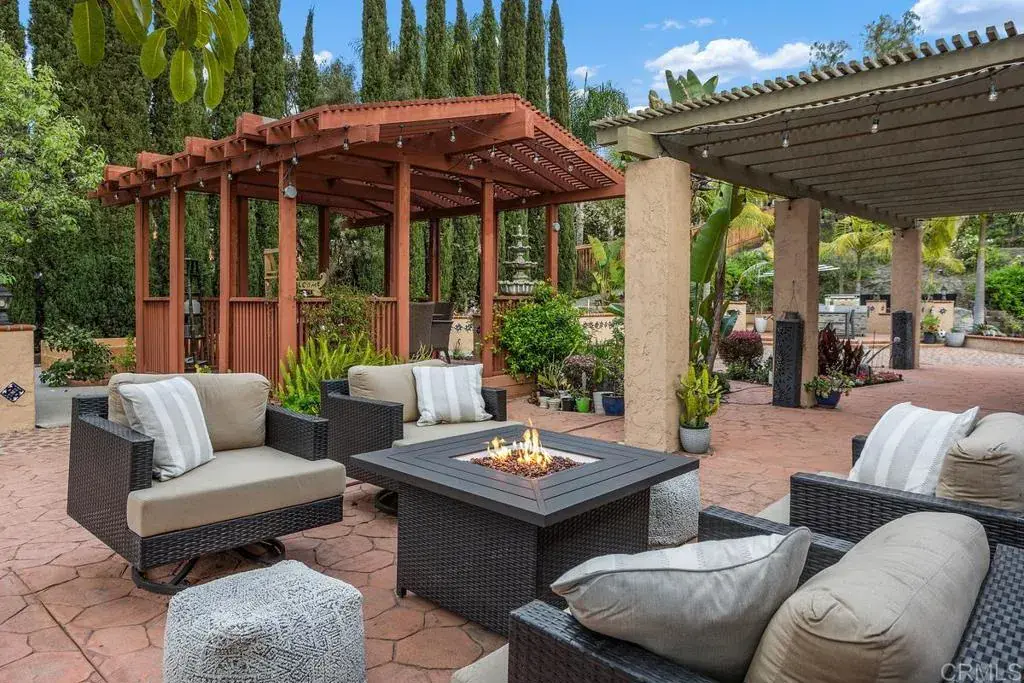 Exceptional single-level estate in the coveted Foothills of Vista offers privacy, luxury, and sweeping views. Situated on a generous 2/3-acre lot atop the historic grounds of the Andersen Nursery, the property is surrounded by lush, mature landscaping and a newly redesigned front yard featuring artificial turf and breathtaking panoramic vistas. Inside, soaring ceilings and an open-concept layout create a bright, welcoming atmosphere enhanced by tasteful upgrades throughout. The newly remodeled chef’s kitchen is the heart of the home, showcasing an extra-large single-slab quartz island, Bosch refrigerator, walk-in pantry, and seamless flow into the family room anchored by a striking European stone veneer fireplace. Designed for effortless indoor-outdoor living, the front living room opens through three expansive sliders to the California room, while the backyard serves as a private entertainer’s retreat with a jasmine-covered pergola, vegetable garden, and multiple spaces for dining and relaxing under the stars.The north wing is dedicated to a luxurious primary suite featuring a sitting area, dual walk-in closets, and a spa-inspired bath with soaking tub and separate shower. The south wing offers three additional ensuite bedrooms, including an impressive guest suite with its own living area and bath—ideal for multi-generational living or extended stays. Additional highlights include a modern Tricorn Black front door with glass insert, premium waterproof vinyl flooring throughout, new LG mega-capacity washer and dryer, two-zone HVAC, a two-car garage with Tesla/EV charger, covered carport, and potential RV parking. Offering valley, mountain, and peek ocean views, this lightly lived-in and meticulously maintained residence blends serene privacy with refined sophistication. A rare Foothills offering and a true must-see.