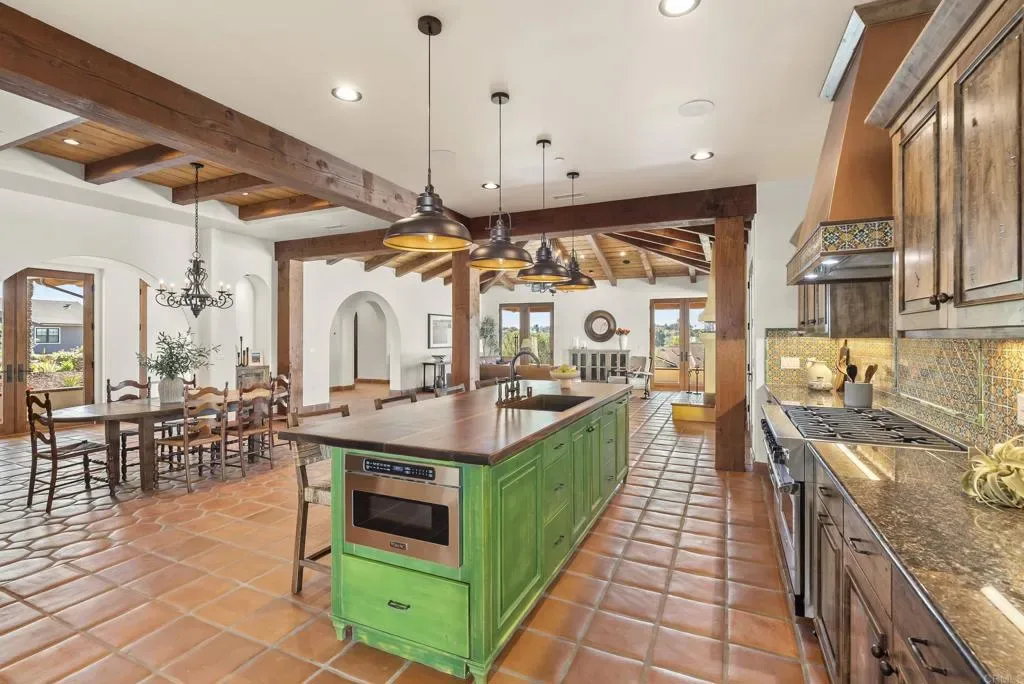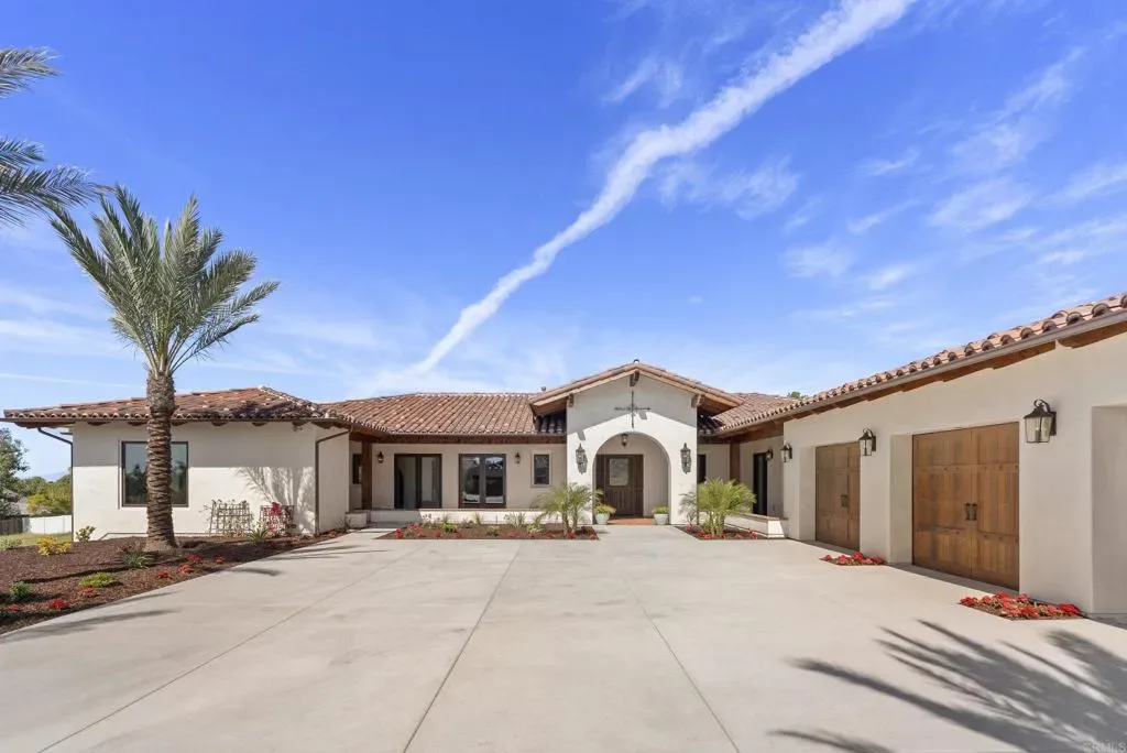 Welcome to this brand new custom Spanish estate, a unique property you might expect to find in Rancho Santa Fe, thoughtfully designed and handcrafted over four years by its owner to honor the romance and integrity of true Spanish architecture. Set on over an acre of Vista land and tucked into a small enclave of custom built homes, this single story residence offers privacy with no HOA and no Mello Roos, all while being less than a 10 minute drive to vibrant Downtown Vista, local dining, shops, and major highways for easy commuting throughout North County. As you approach the home, the classic Spanish tile roof, covered wraparound front patio, and handcrafted wood garage doors immediately set the tone. Upon entering, your gaze is drawn to a custom stained glass window at the entry, an artistic ode to Spanish nature that casts warmth and color as it frames the front door and welcomes you inside. The front door and arched interior doors were all handcrafted by the seller, further adding to the authenticity and architectural integrity of the home. Offering 3 bedrooms, 3.5 oversized bathrooms, and a spacious den, the flexible layout is designed for both everyday living and elevated entertaining, with the den easily serving as a game room, playroom, executive office, or even a fourth bedroom. Inside, soaring vaulted wood trimmed ceilings, rich warm wood posts, graceful arches, and Sausalito tile flooring create depth, texture, and architectural character throughout the home. At the heart of the estate, the chef’s kitchen is both striking and functional, featuring an 8 burner Viking range, built in side by side refrigerator, and a custom copper hood that anchors the space with warmth and craftsmanship. Custom cabinetry includes thoughtful pull out drawers for organization, while a large walk in pantry offers wall to wall storage and a dedicated appliance counter to keep everyday essentials tucked away. Aluminum clad French patio doors line the home, filling the interior with natural light and seamlessly blending indoor and outdoor living. A dramatic gallery hallway illuminated by statement chandeliers leads to thoughtfully curated spaces, including two statement fireplaces, one anchoring the main living area and another creating ambiance on the covered outdoor patio. A cozy oversized reading nook is perfectly positioned to capture glowing western sunsets, while one bedroom is thoughtfully split from the others, ideal for generational living or private guest quarters. The primary suite offers a true sanctuary with private patio access, custom bedroom cabinetry, an expansive custom walk in closet, and a spa inspired bathroom featuring a jetted soaking tub and oversized walk in shower adorned in Spanish tile. Even the everyday spaces were elevated, including a generous laundry room with ample storage and under cabinet lighting. Designed for year round comfort, the home features dual air conditioning systems, whole home surround sound, and a fully integrated security video system. An oversized three car garage with custom wood doors completes the property, while the expansive acreage offers room to build your own dream yard spaces, whether you envision a pool, garden retreat, sport court, or outdoor kitchen under the stars. This is more than a home. It is a labor of love, built with heart, heritage, and intention. Your next chapter begins right here at 2525 Date Palm Court in Vista.