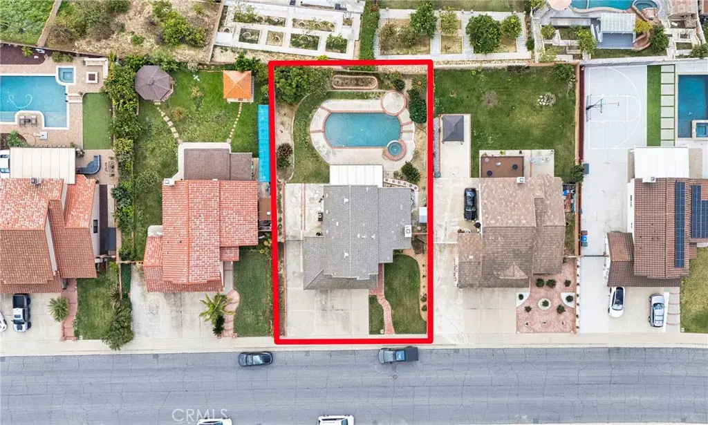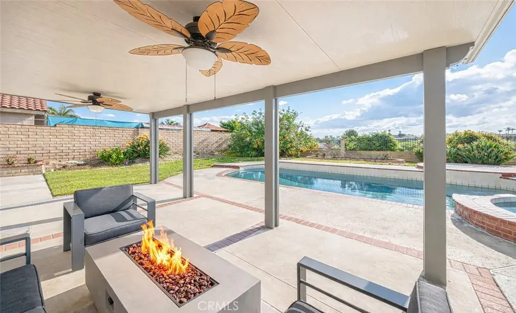The backyard is perfect for entertaining with a newer patio, sparkling pool, fruit trees, and landscaped grounds, situated on an approximately 8,845 sq ft lot.