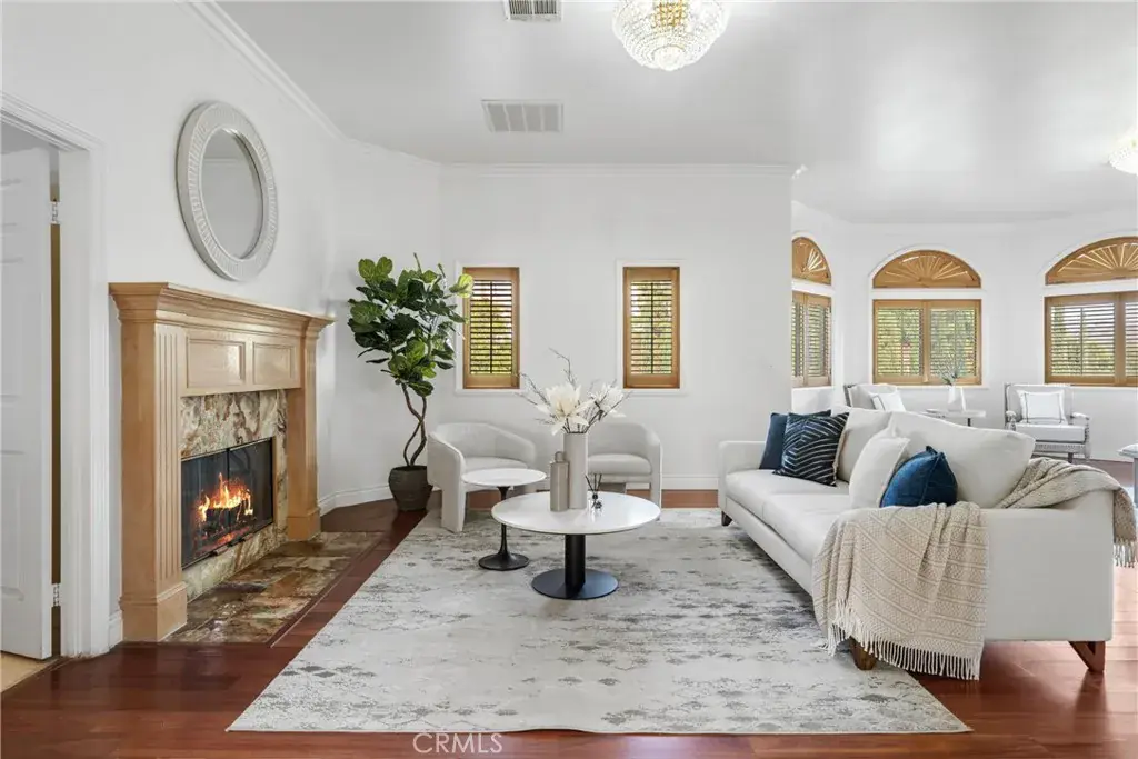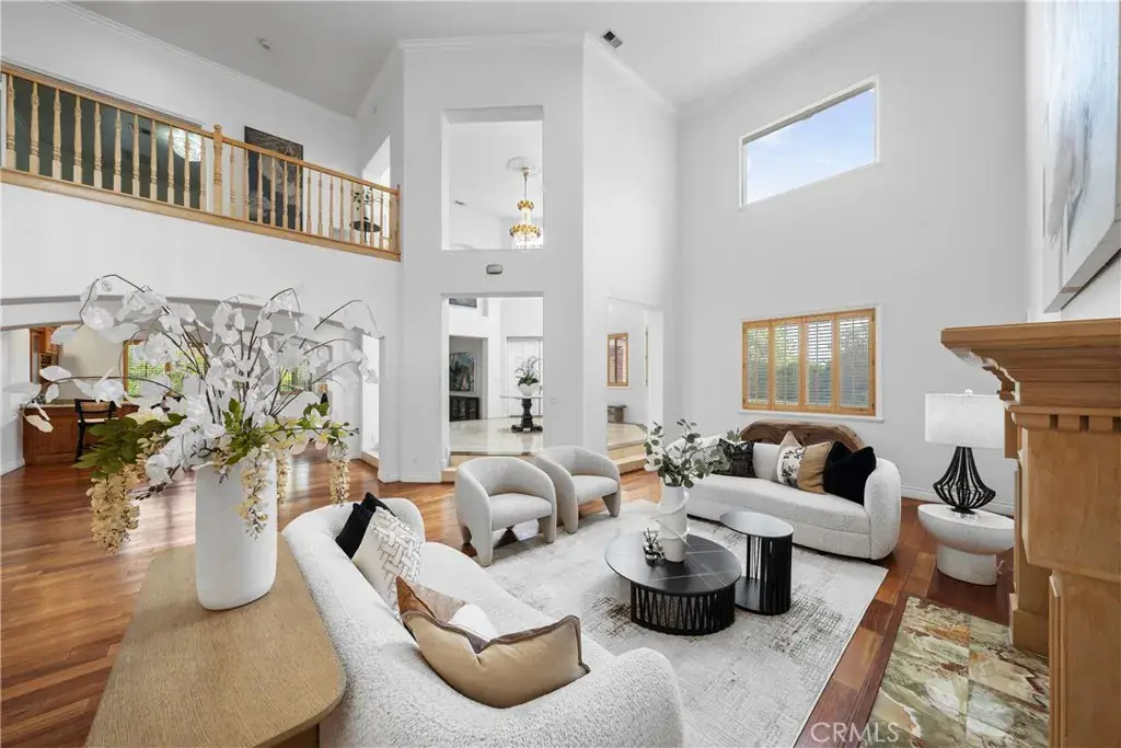 Grand Interiors. Step through the double doors into an impressive foyer crowned with a dazzling crystal chandelier and soaring ceilings that immediately evoke a sense of grandeur. The formal living room exudes warmth and elegance with its cathedral ceiling and fireplace, while the formal dining room provides an exquisite setting for hosting lavish gatherings.