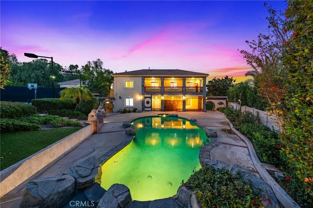 The resort-style backyard is a true sanctuary—complete with a sparkling pool and spa, waterfall feature, full-size tennis court with lighted, outdoor BBQ pavilion, gazebo, and a tranquil Chinese-style garden surrounded by fruit trees and lush landscaping.