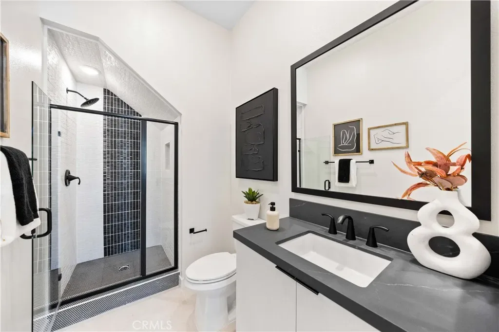 The gourmet kitchen is designed for culinary enthusiasts, equipped with a high-quality gas range, dishwasher, shaker-style cabinets, and gleaming quartz countertops. The expansive primary suite boasts a walk-in closet and an ensuite bath with an oversized glass shower offering a spa-like retreat.