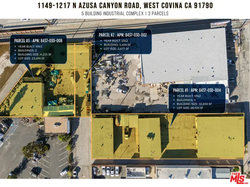 The property is comprised of 1149 – 1217 N. Azusa Canyon Road and offers a rare opportunity to acquire a multi-tenant industrial warehouse complex in the highly sought-after West Covina industrial corridor. The property consists of five industrial buildings totaling approximately 16,272 SF of rentable building area, currently leased to six tenants, providing both stable in-place income and rental upside. Three of the tenants are on month-to-month leases. Constructed in 1962 and 1963, the buildings span three parcels totaling approximately 46,295 SF. The site is zoned WCM1YY, allowing for a wide range of industrial uses, including warehousing, distribution, fabrication, and light manufacturing, making the property highly functional and versatile for various businesses and operators. The buildings feature wood-frame and stucco construction, a 12-foot clear height, and nine ground-level roll-up doors, supporting efficient loading and unloading. The buildings feature a fenced lot, ample parking spaces, and multiple drive-in doors (10’W x 10’H). The property also offers approximately 34 on-site parking spaces (2.0/1,000 SF), with frontage and easy ingress/egress along Azusa Canyon Road, which enhances overall usability and tenant appeal.