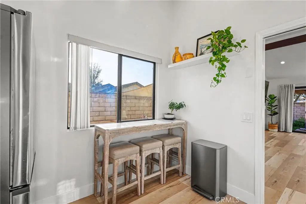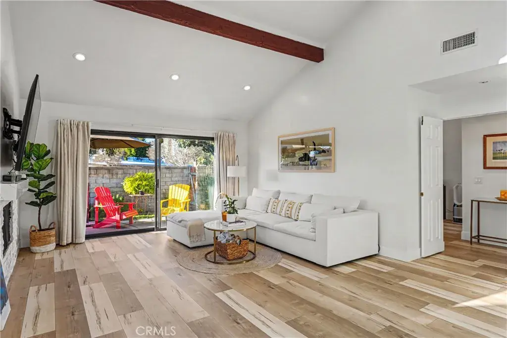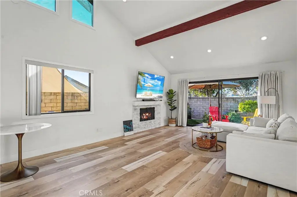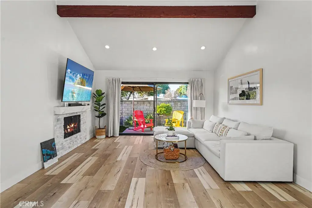 Upon entering, you’re greeted by a spacious open floor plan that seamlessly connects the dining and living areas. The vaulted ceilings and abundant natural light create an airy, inviting atmosphere. The living room features a cozy brick-accented fireplace and a full wall-sized sliding glass door that opens to a beautifully maintained backyard. The modern kitchen is a standout, featuring white cabinetry, gleaming quartz countertop, the matching backsplash, a farmhouse sink accented by elegant gold-tone fixtures, and stainless-steel appliances—including a newer range, microwave, dishwasher, and newer refrigerator.