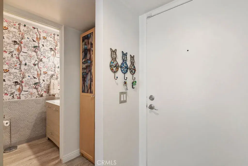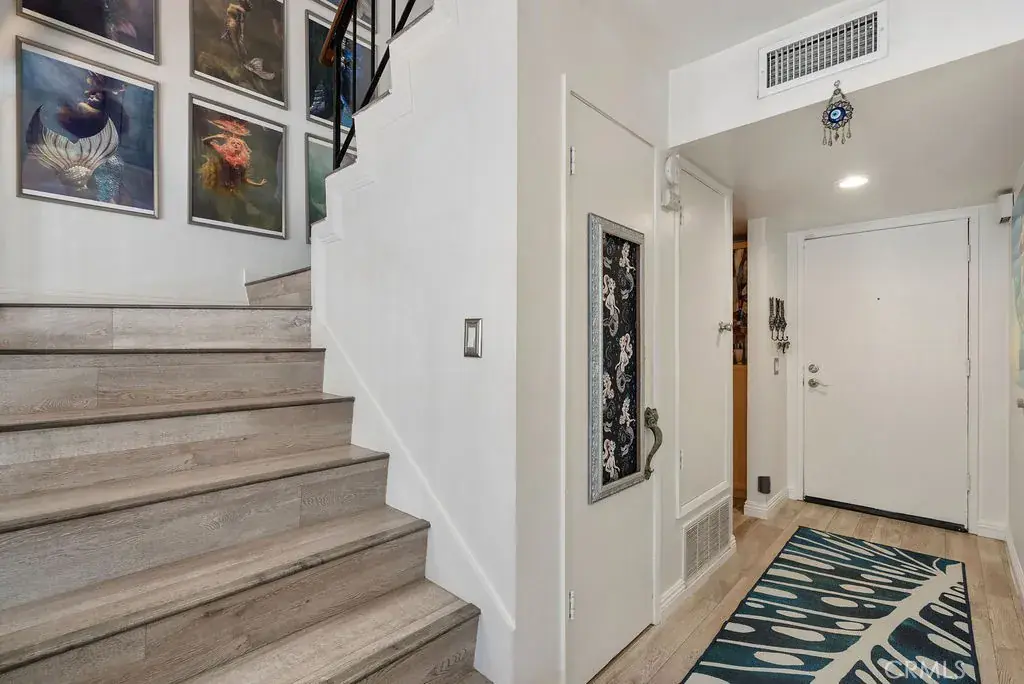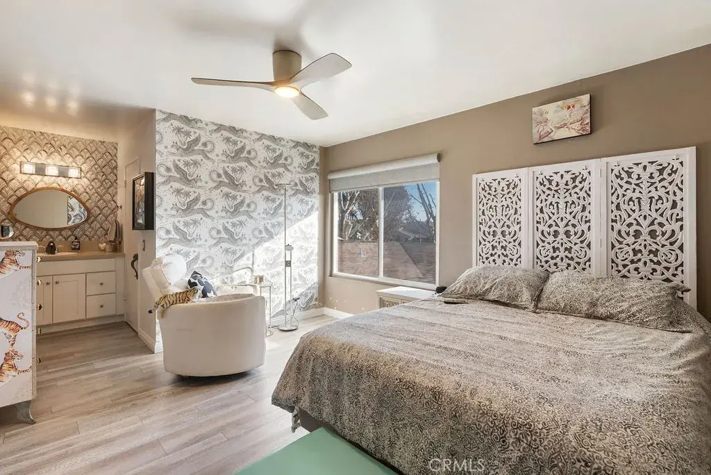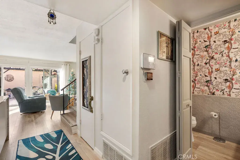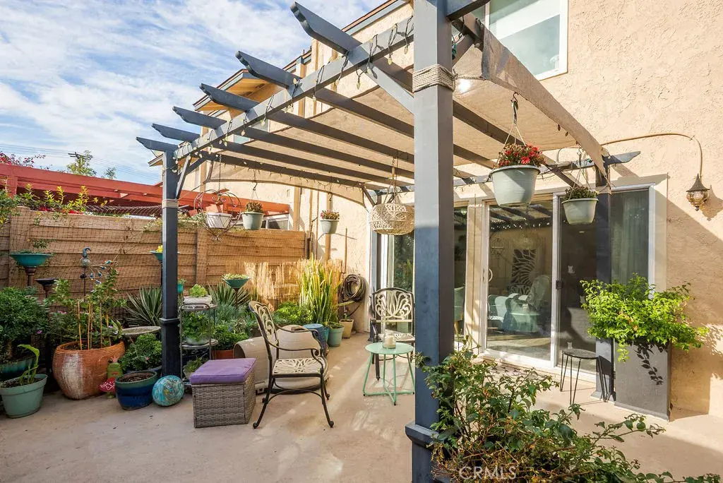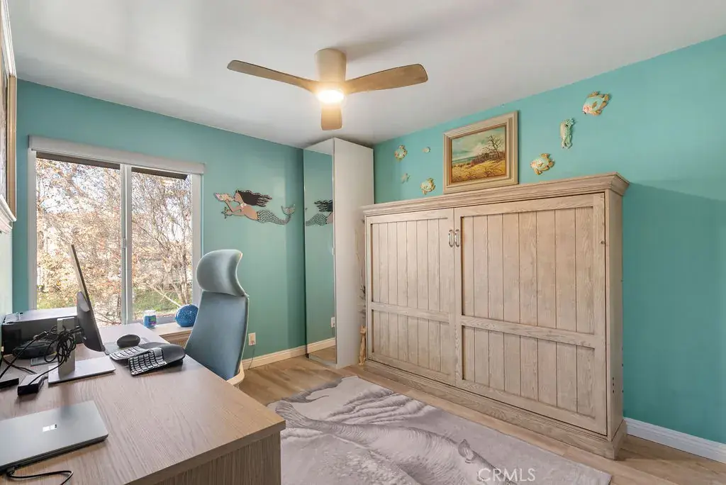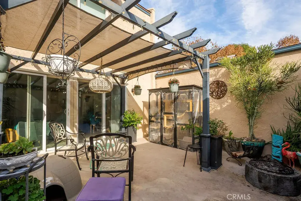 Dining Room/Living Room with Double sliding glass patio doors gives you almost a complete wall of glass with a true California setting, and for your fur babies, a built in pet door to the Patio* Large ,17/20 Patio with lighted Pergola with sunscreen with Ample outdoor living space. Beautiful Custom Screen Door, leads to garage access *Secondary bedroom 1*Newly remodeled with wardrobe system and loads of storage, Murphy bed for guest with newer memory foam mattress*Secondary Bedroom 2* has a great view with built-in closet*