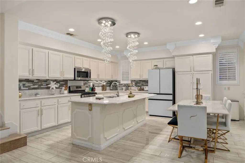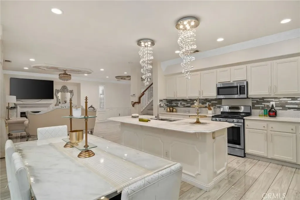 Deeper into the home, the open-concept family room shines with custom drapery, striking chandeliers, rich wall woodwork, and a cozy fireplace. The space flows seamlessly into the beautifully upgraded kitchen and breakfast nook, offering both style and functionality. Sliding doors from the breakfast nook lead to the backyard, making entertaining effortless. A recently renovated full bathroom is conveniently located on the main floor.