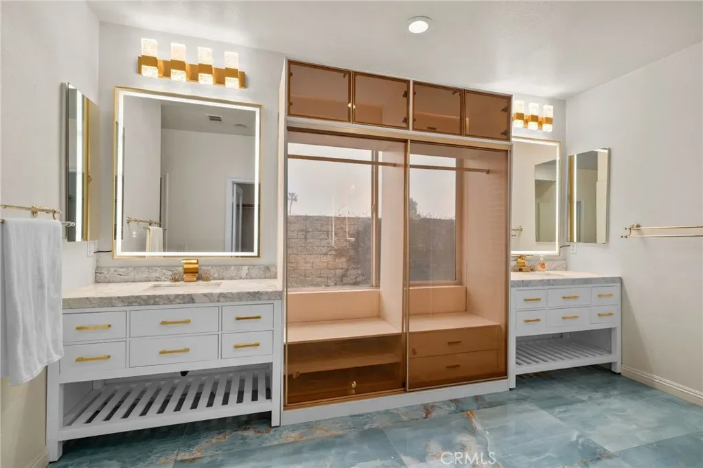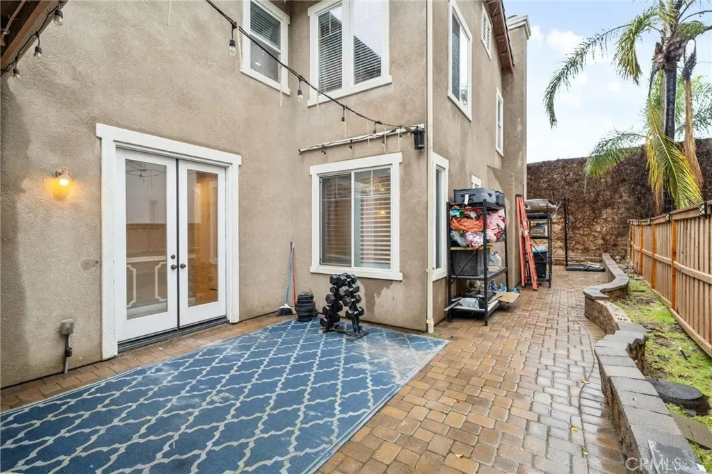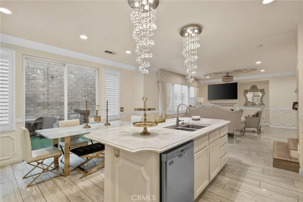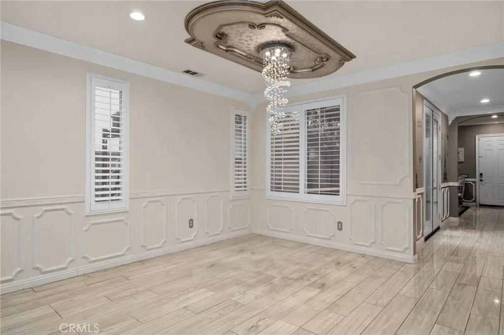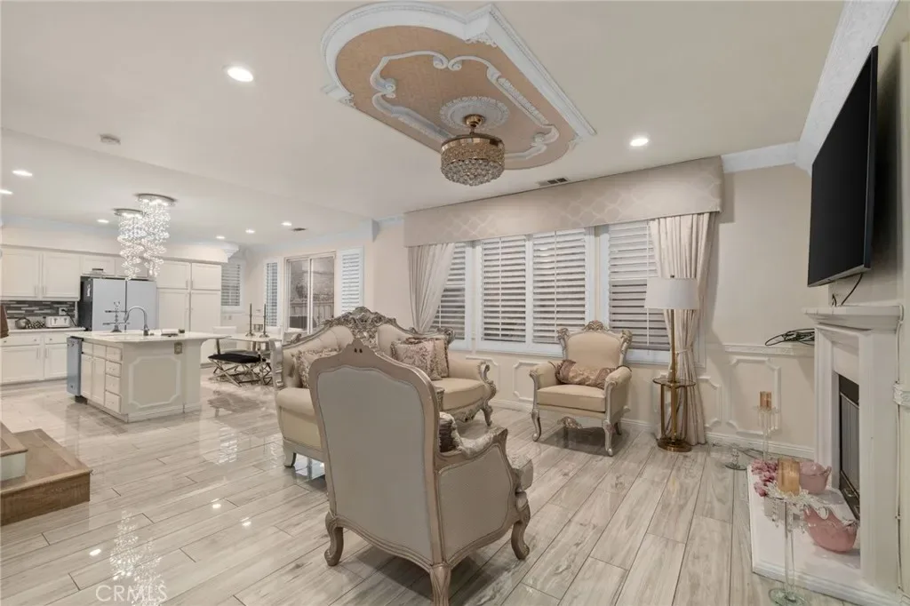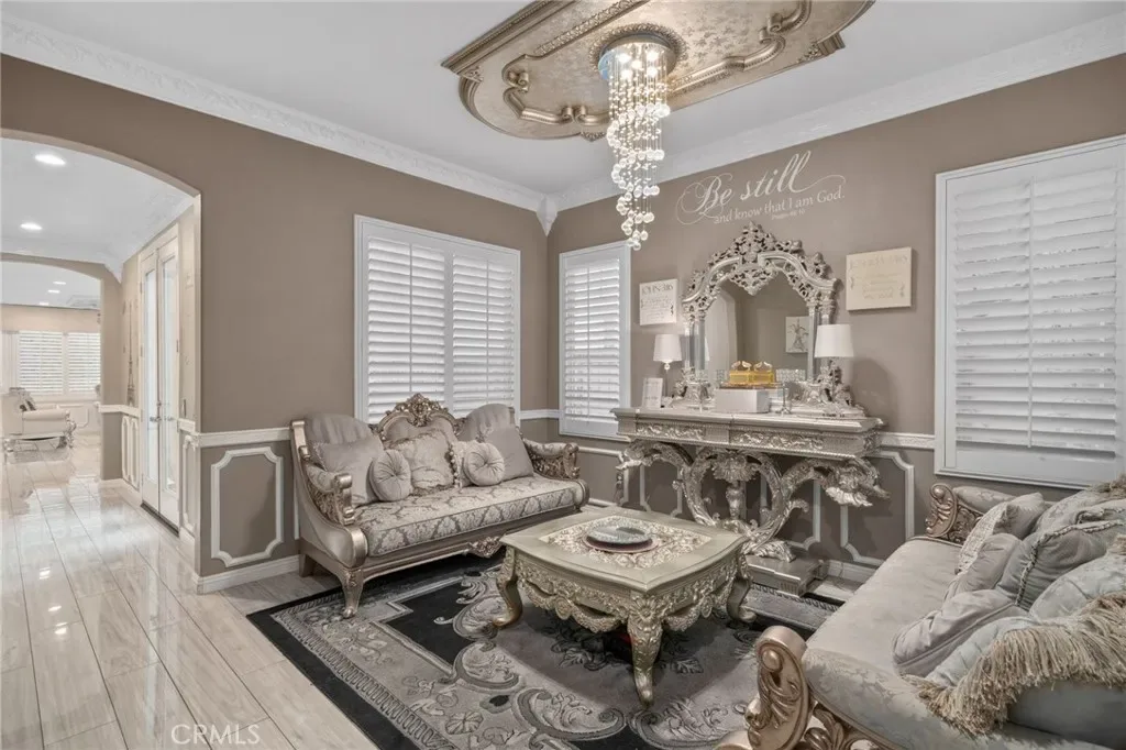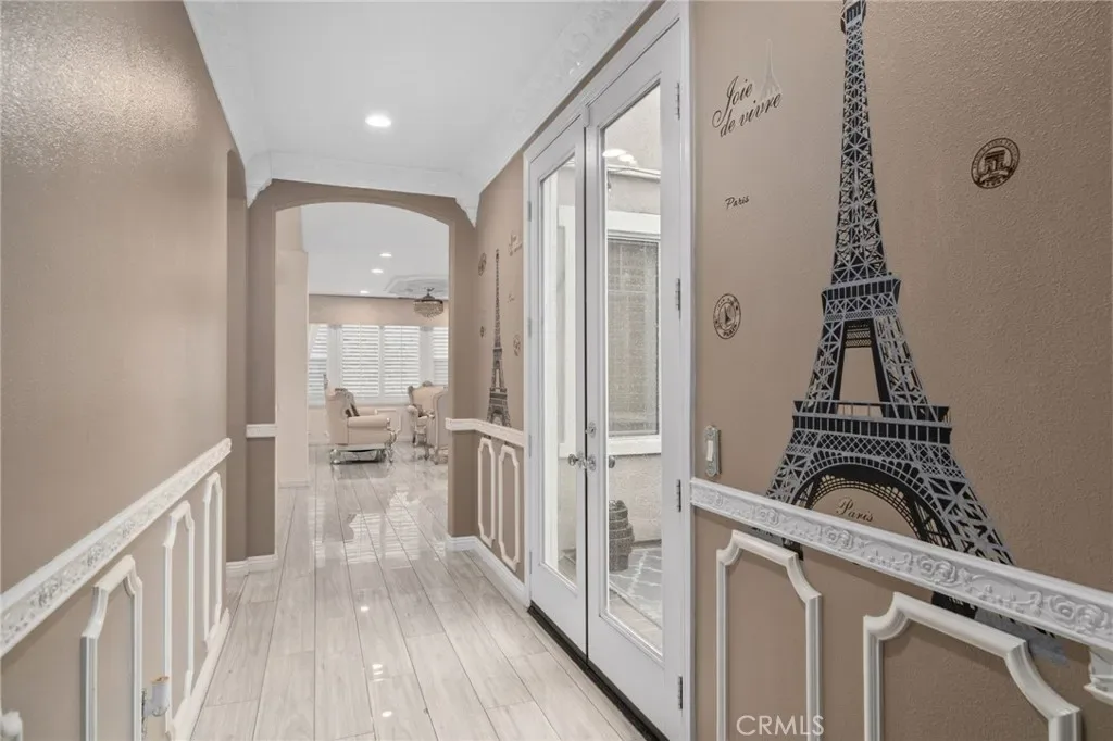 Step through the entry into the formal living room featuring plantation shutters, detailed wall woodworking, a breathtaking chandelier, and crown molding that adds warmth and character. French doors open to a serene courtyard, creating the perfect indoor-outdoor flow. The formal dining room is equally impressive with exquisite wall décor, plantation shutters, and an eye-catching chandelier that elevates every gathering with a touch of Paris-inspired luxury.