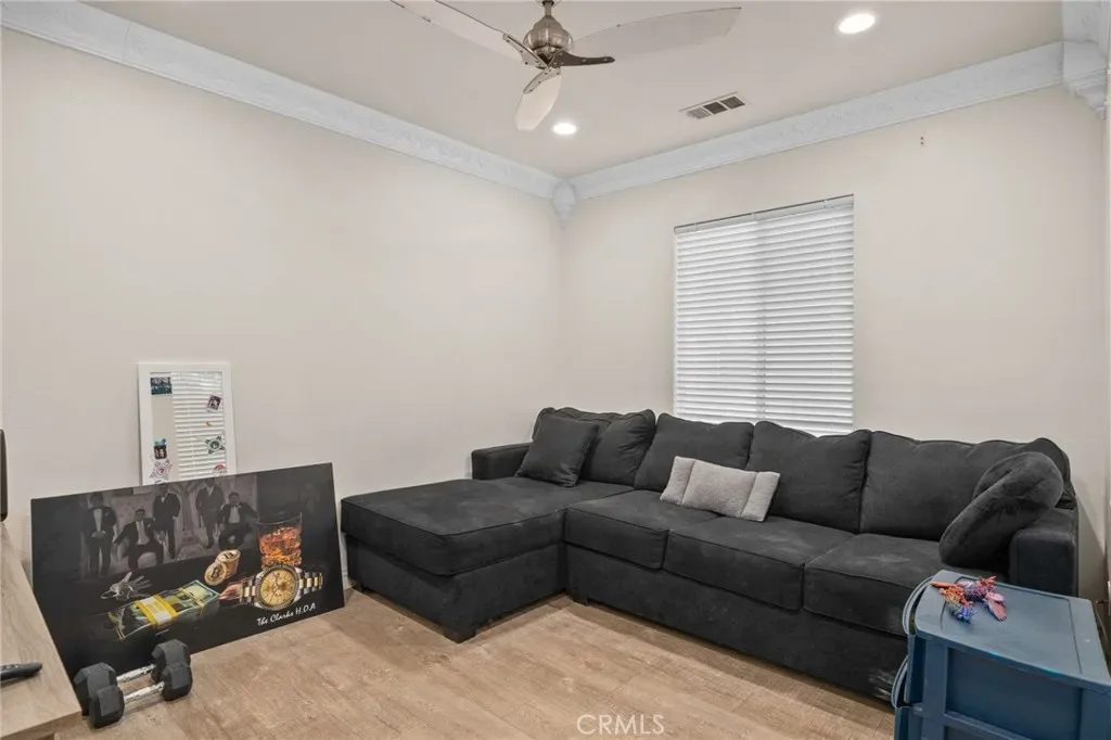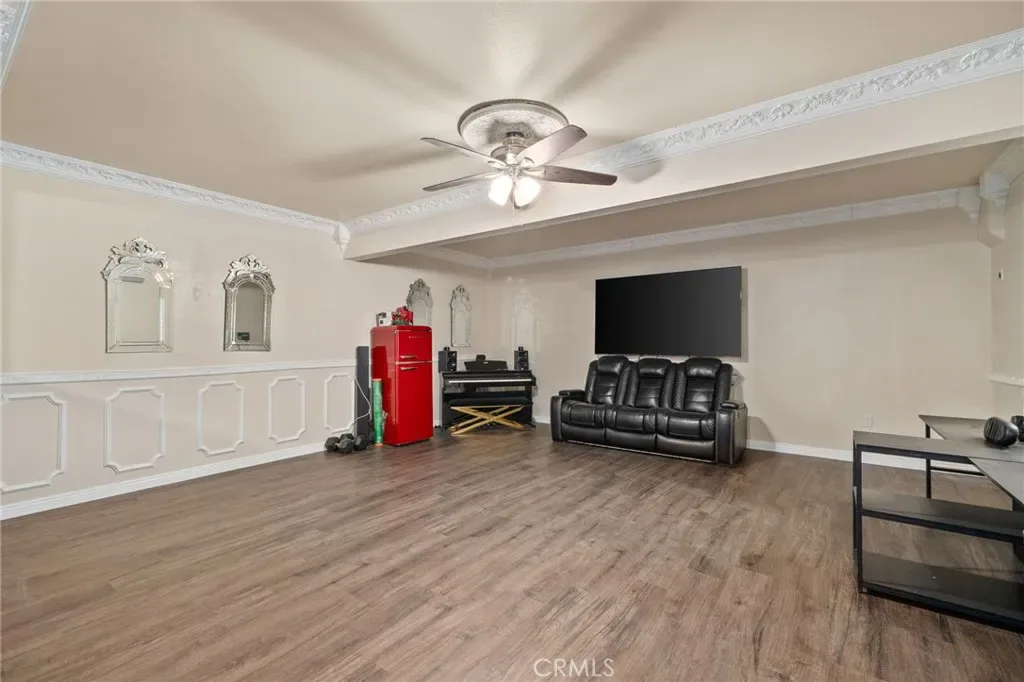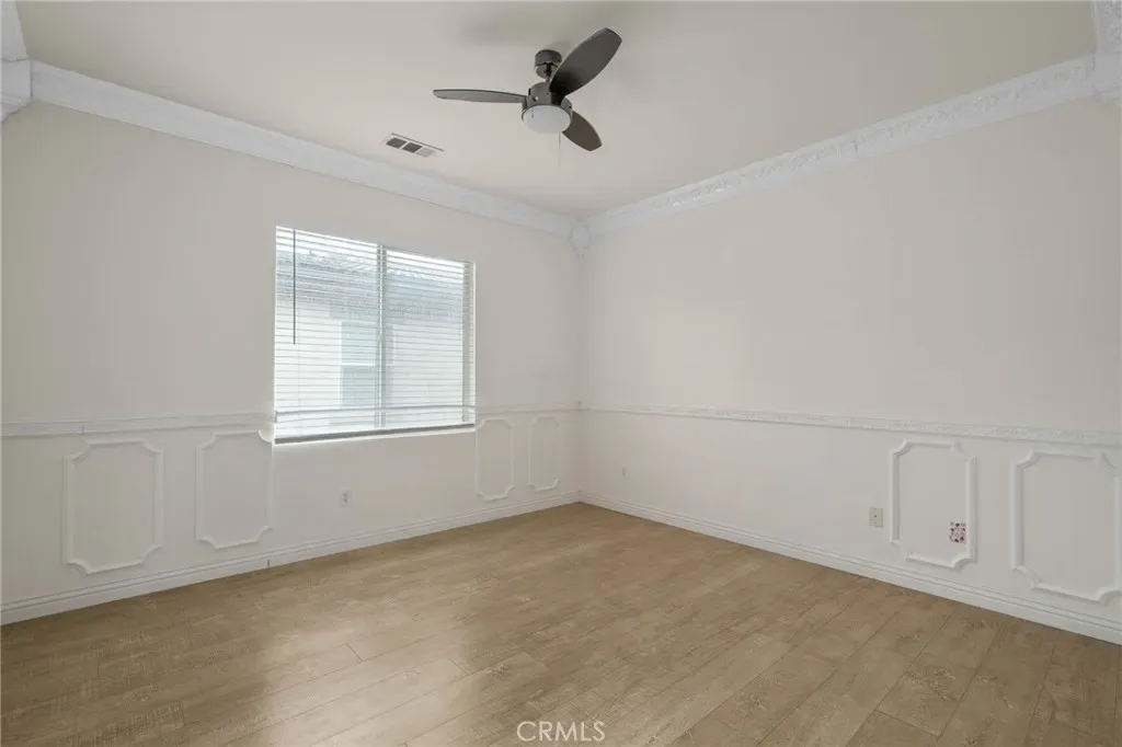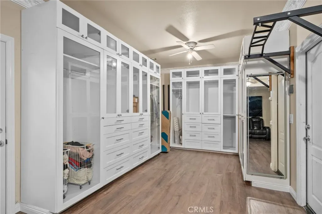 The garage has been thoughtfully converted into a bedroom complete with a custom closet, built-in cabinetry, ceiling fan, crown molding, and detailed wall woodwork—ideal for guests, extended family, or a private office.