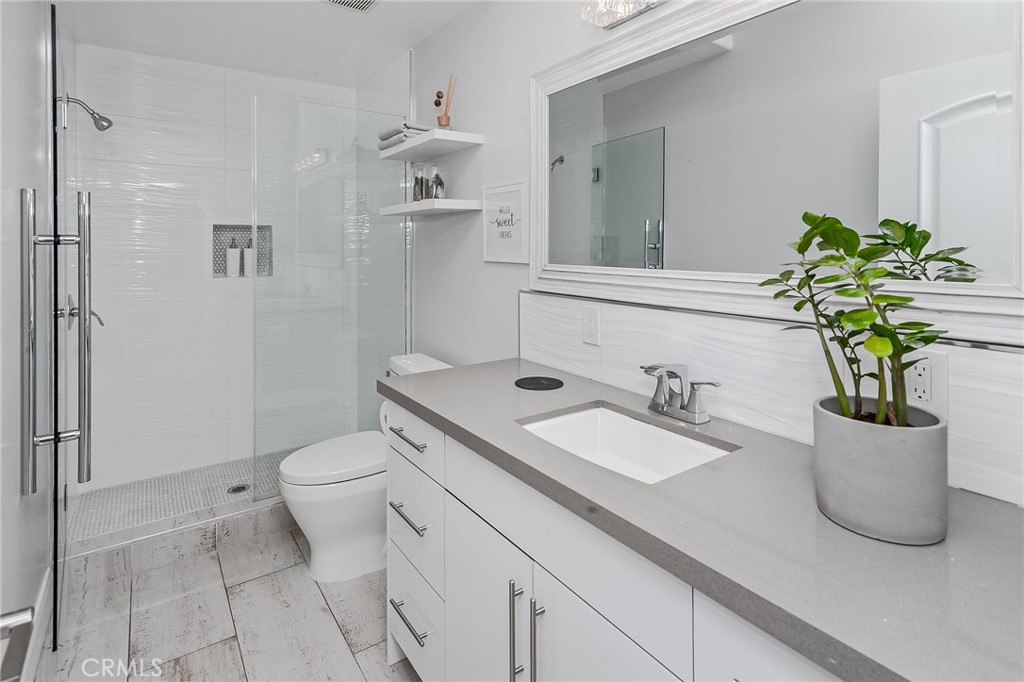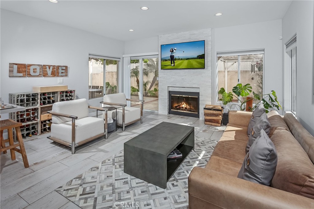 Welcome to a refined residence where light, space, and elegant design create an exceptional living experience. Located within the prestigious GATED COMMUNITY of La Villanueva, this beautiful home offers a rare blend of comfort, privacy, and timeless style. The front yard welcomes you with a lush green lawn, classic rose bushes lining the walkway, and nearby fruit trees that attract butterflies and hummingbirds, creating charming curb appeal. Inside, an open-concept floor plan enhanced by architectural elements creates a sense of space and natural light, allowing the living areas to flow seamlessly together for both everyday living and entertaining. The living room showcases soaring ceilings and abundant natural light from a multitude of windows, creating a warm and inviting atmosphere. At the heart of the home, the kitchen blends modern design and functionality. A large island with sleek stone countertops provides generous space for gathering and meal preparation, while crisp white cabinetry offers abundant storage. A farmhouse sink sits beneath a large garden window, and an elegant crystal-style light fixture highlights the island. Stainless steel appliances include a Samsung dishwasher, Samsung microwave with two-level grids, and a Fisher and Paykel gas range. The dining room is bright with natural sunlight from a large window overlooking the outdoor seating area. Nearby, the family room centers around a striking feature wall with gas fireplace and a full wet bar with space for a wine refrigerator and bar seating. The serene primary suite offers soaring ceilings, recessed lighting, a decorative fireplace, and a private balcony. Two spacious walk-in closets provide generous storage. The primary bathroom offers a spa-inspired setting with a freestanding soaking tub, a frameless glass-enclosed shower with waterfall showerhead and handheld fixtures, and a double vanity. Four additional bedrooms, including one on the main level, offer flexibility for family, guests, or office needs. Bathrooms feature stone countertops, frameless glass-enclosed showers and bathtub-shower combinations, designer lighting, and elegant tile flooring. The backyard offers a beautiful outdoor setting with colorful flowerbeds, a covered pergola ideal for al fresco dining, and a second pergola accented with young star jasmine, creating a peaceful outdoor retreat. This elegant residence offers privacy, beauty, and timeless comfort. This is a home that truly must be experienced in person