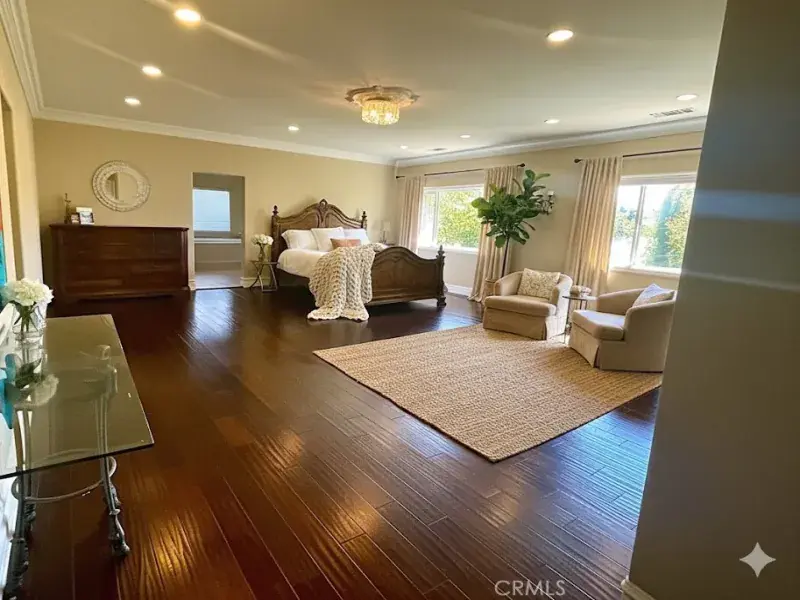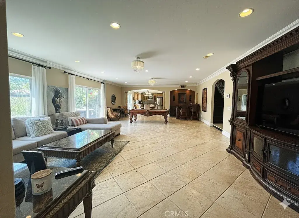 This elegant home features 5 bedrooms, 4 bathrooms, and a dedicated office/library, filled with natural light and serene views from nearly every room. Inside, enjoy custom cabinetry, rich travertine and hardwood floors, a wrought-iron staircase, and a dazzling chandelier. Expansive living spaces, detailed moldings, recessed lighting, a dedicated bar, and game area provide perfect settings for both family living and entertaining.