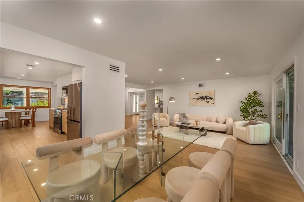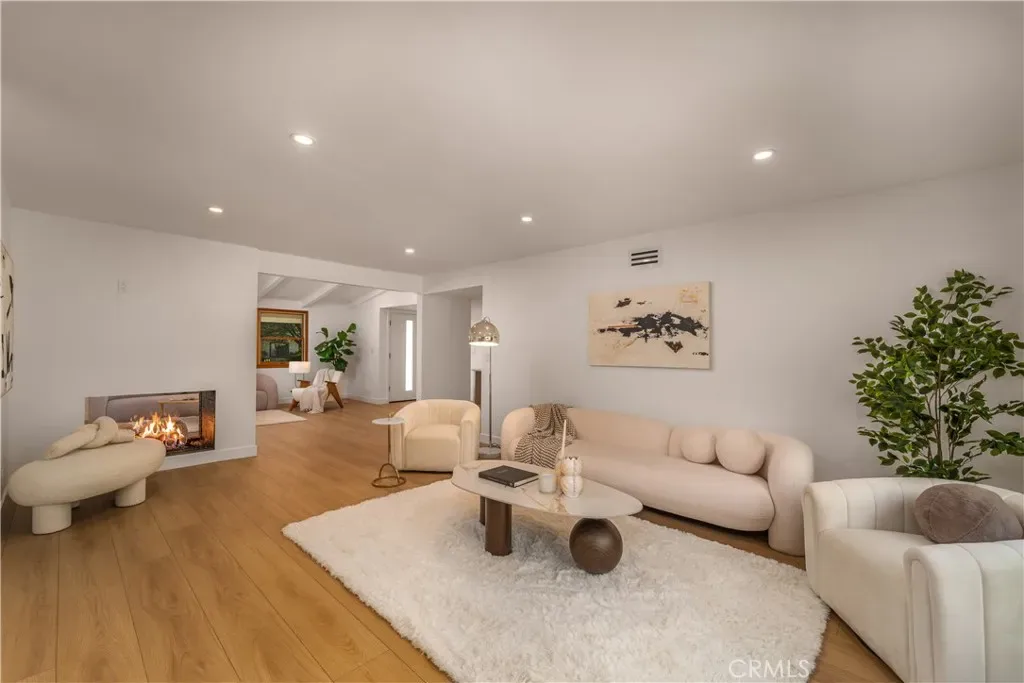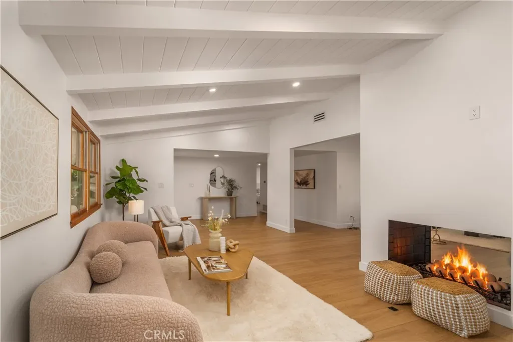 The interior has been thoughtfully remodeled, including a custom-designed kitchen with brand-new, high-tech appliances, sleek finishes, and ample storage. A dedicated dining area and cozy breakfast nook provide flexible dining options, while the remodeled bathrooms are refined and modern. A striking double-sided fireplace adds warmth and architectural interest between the living room and family room.