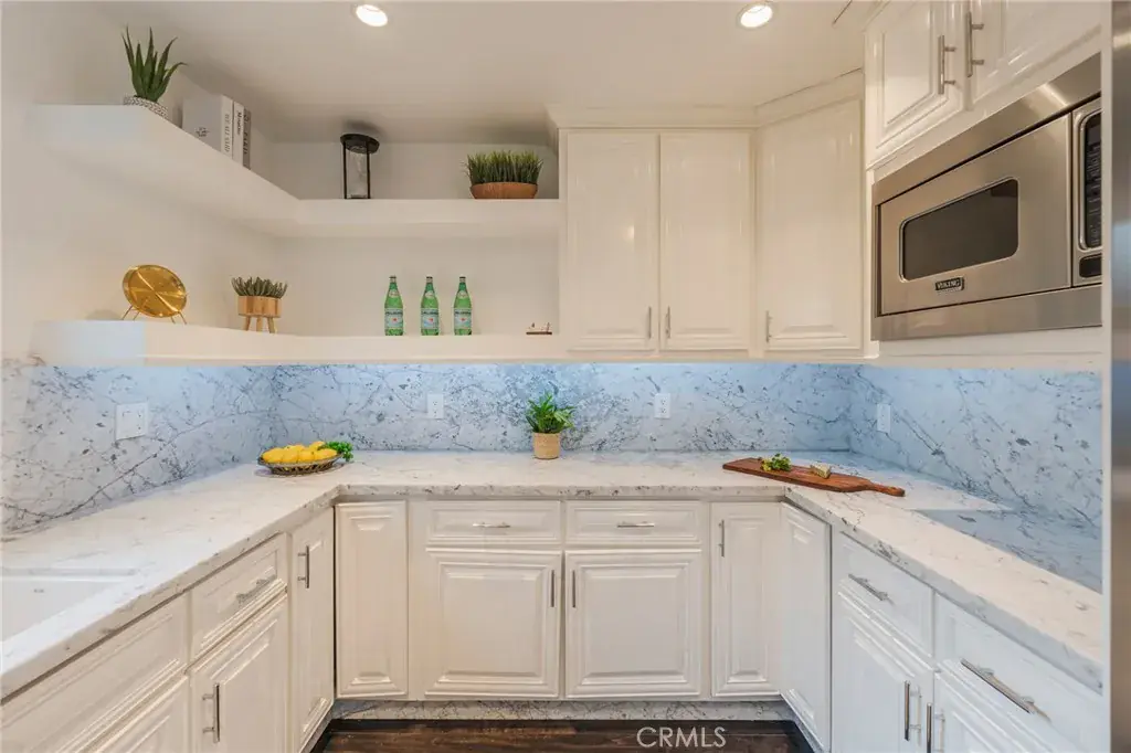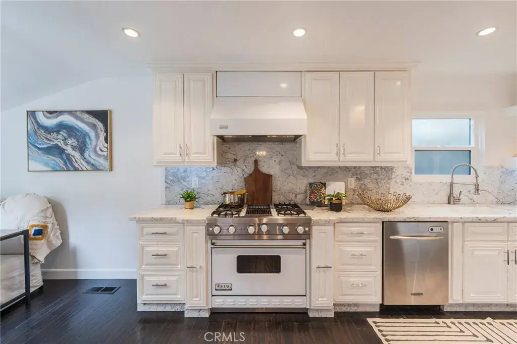 The open floor plan features hardwood floors, recessed lighting, a fireplace, and central HVAC, along with a chef’s kitchen appointed with Viking appliances and honed Carrera marble countertops.