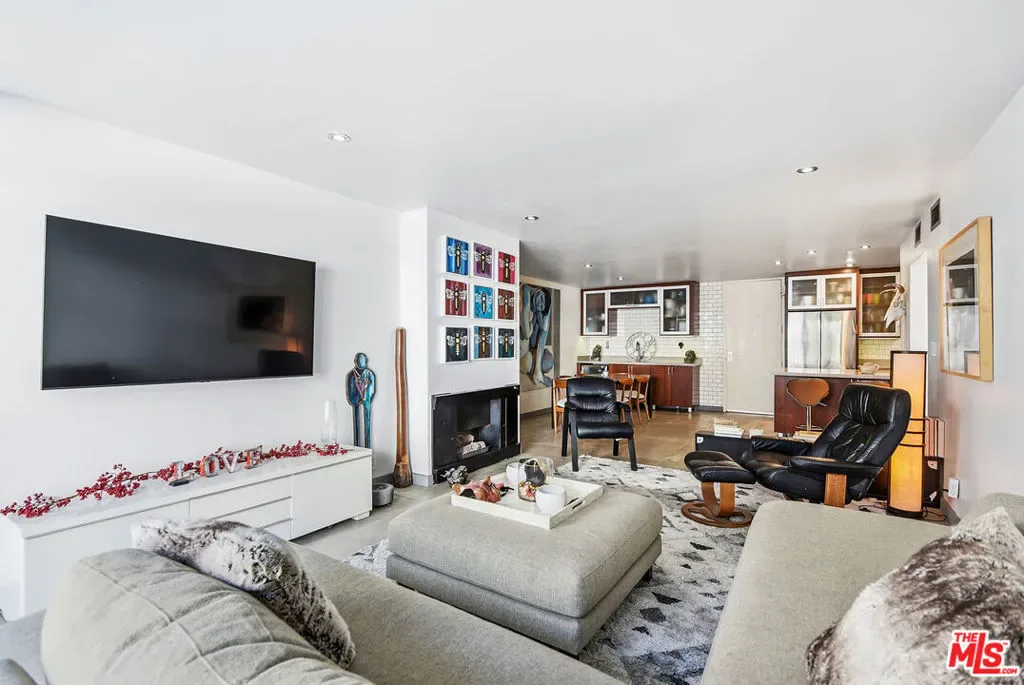 Bright and spacious 2-bedroom + 2-bath residence in the heart of West Hollywood. This open living space has great flow that connects the kitchen, dining area and expansive living room, creating a comfortable layout for both everyday living and entertaining. Recessed lighting and large-format polished concrete-style flooring carry throughout, adding a clean, modern feel. A generous living room with fireplace opens to a private balcony, creating an easy indoor-outdoor connection. The updated kitchen features stainless steel appliances, quartz countertops, sleek tile backsplash and ample cabinetry with additional bar seating. A built-in bar area with a wine fridge and secondary sink adds convenience and is ideal for entertaining. Both bedrooms are well-proportioned with great natural light and ample closet space, including a primary suite with direct access to a remodeled bathroom with dual sinks and a walk-in shower. Additional features include generous storage, modern finishes throughout and a well-maintained building with lush landscaping and pool amenities. Ideally located just off the Sunset Strip with close proximity to LA’s best dining, shopping and nightlife.