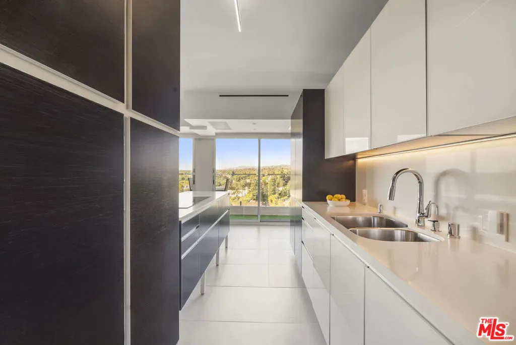 Positioned on the 12th floor of iconic 838 Doheny, this two-bedroom, two-bath residence offers one of the building’s most sought-after floor plans with unobstructed west-facing views over Beverly Hills. Wrapped in glass, the residence was reimagined with custom finishes throughout, including a German Alno kitchen, Calacatta Borghini de Oro marble baths, bespoke Kneedler Fauchere wallcoverings, tall custom doors with curated hardware, Lutron linear lighting, smoked glass architectural elements, new appliances, and an integrated smart home system. Fleetwood sliding glass doors open to an extended terrace with panoramic city and mountain vistas framed by endless Sunsets. *Can be sold fully furnished.* The building has completed a $14M structure modernization and offers 24-hour concierge and valet, on-site management, two pools, and a newly renovated rooftop fitness center.