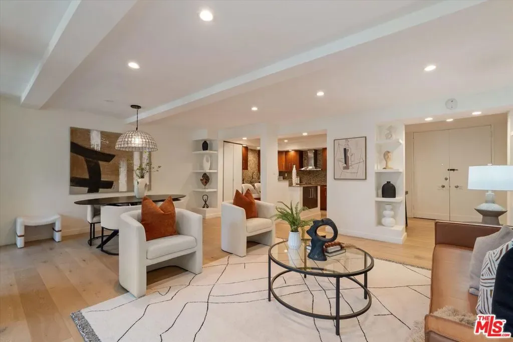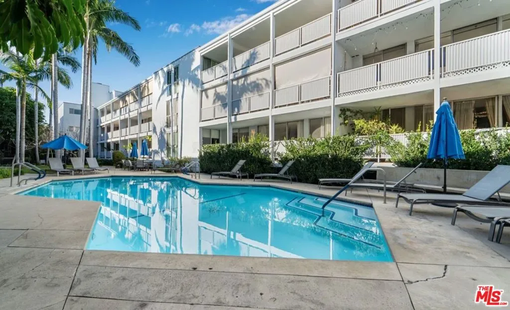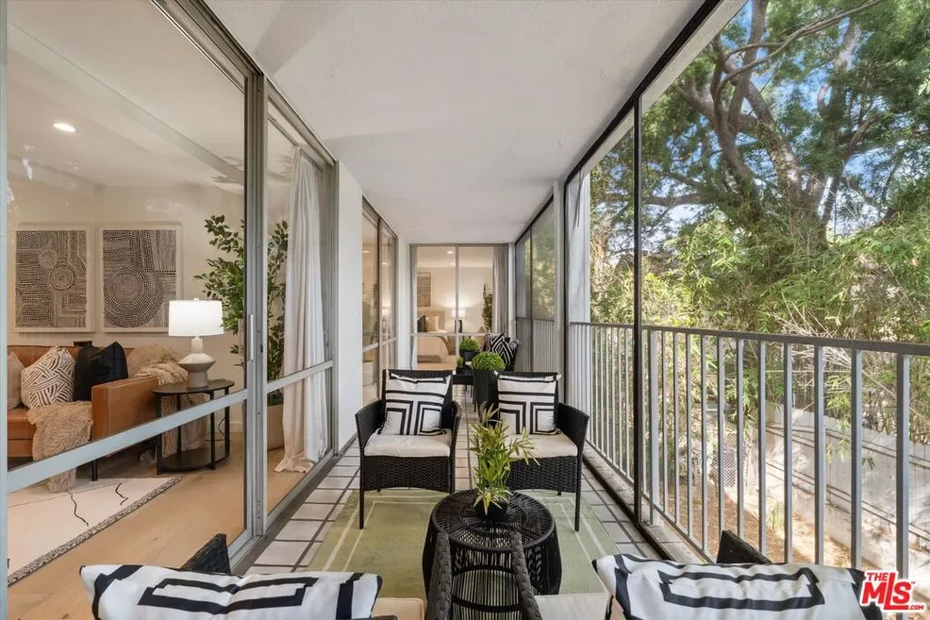 Tucked quietly at the rear of the building in prime West Hollywood, this 1317 sf, 2-bedroom, 2-bath residence feels like a hidden retreat in the middle of the city. What truly sets it apart is the oversized, fully enclosed balcony that spans the entire length of the condo, and surrounded by lush, mature greenery. Floor-to-ceiling glass brings the outdoors in, creating a calm, treehouse-like setting that’s both private and serene. Inside, the layout is idyllic and functional with a formal entry, open living and dining areas, and a sleek kitchen with a large island and generous storage – perfect to entertaining guests! The primary suite is spacious and tucked away, featuring an updated en-suite bath and ample closet space with walk-in, while the second large bedroom offers flexibility for guests, a home office, or both. An updated hallway bathroom with shower over tub is great for your guests. Additional features include central air & heat, recessed lighting, custom shelving, smart light fixtures, in-unit laundry, and two side-by-side parking spaces and designed large storage closets. Located in the gated Kings Plaza community with a resort-style pool, spa, and lush courtyard, just moments from Melrose, Santa Monica Blvd, and the Sunset Strip. Welcome home!