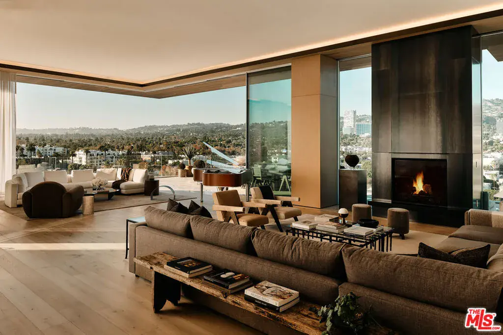 Introducing Penthouse West at 8899 Beverly – the largest top-floor residence in this Olson Kundig-designed architectural masterpiece in West Hollywood’s Design District. This sprawling 7,303-square-foot penthouse is an art collectors dream. Experience full-service, luxury living with 4 bedrooms, 5 full bathrooms, 2 powder rooms, and a versatile media room set up as private office space apart from the main residence living areas. Designed to impress, the Penthouse features a great room with soaring 14-foot floor-to-ceiling motorized Vitrocsa glass walls that open to a 1,900-square-foot wraparound terrace with breathtaking, panoramic views of the Hollywood Hills and Los Angeles skyline. The gourmet kitchen pairs functionality with artistry, boasting Calacatta gold marble countertops, custom white oak cabinetry, and premium appliances by Gaggenau, Miele, and Subzero. A separate butler’s kitchen and discreet service entrance enhance the penthouse’s hosting capabilities, ideal for entertaining at scale or enjoying intimate gatherings. The expansive primary suite, a private sanctuary over 1,000 square feet, includes dual walk-in closets, luxurious dual bathrooms, and direct access to the terrace, offering uninterrupted views of the Hollywood hills. The three guest bedrooms feature ensuite bath and stunning south-facing views, providing the utmost privacy and comfort. For the car aficionado, Penthouse West features a private four-car autostable behind bespoke enclosed doors, plus two additional valet spaces, accommodating up to six vehicles. A private and discreet Penthouse lobby in the garage offers direct elevator access to the top floor. Exclusive resident amenities elevate the experience further, with a resort-style pool, outdoor kitchen, fireplace gardens, fitness center, and yoga studio. Situated in the heart of the West Hollywood Design District, this penthouse boasts a Walk Score of 92, with Bristol Farms, high-end dining, designer boutiques, and entertainment just steps away, delivering an unparalleled lifestyle in one of LA’s most coveted and walkable neighborhoods.