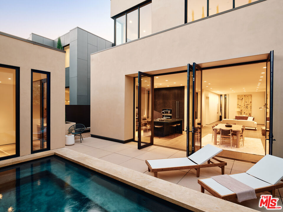 Brick House by Olson Kundig at 8899 Beverly | This distinctive architectural residence combines the privacy of a single-family home with the services of a luxury building in the heart of West Hollywood. One of only eight signature houses within the development, Brick House celebrates the warmth and texture of clay-fired brick through Olson Kundig’s expressive material design, giving the home its unmistakable personality and mid-century spirit.The residence offers three bedrooms and two and a half bathrooms. A brick-surrounded fireplace anchors the living room, while Fleetwood doors open wide to the sunny private courtyard for effortless indoor-outdoor living. The kitchen features an oversized island with ample room for meal preparation and casual dining. Interior finishes include dark-stained quarter-sawn walnut casework and wood flooring throughout.Upstairs, the primary suite opens to a private balcony with views of the Hollywood Hills and includes a walk-in closet and spa-like ensuite bathroom.The sunny Mediterranean-inspired courtyard is centered around an oversized outdoor spa framed by sandstone pavers and cypress trees. A detached studio on one side of the courtyard offers a peaceful retreat-ideal for an office, meditation room, home gym, or artist studio- while the opposite side includes an outdoor shower and enclosed powder room. Among the most character-driven homes in the collection, Brick House offers the privacy of a detached architectural residence paired with the convenience and services of a full-service building. Located in one of West Hollywood’s most walkable neighborhoods. As part of the Olson Kundig-designed 8899 Beverly development, homeowners enjoy access to 24-hour concierge and property management services, a state-of-the-art fitness center, and a landscaped amenity deck with resort-style pool and spa and a custom outdoor kitchen. One of the final remaining homes available in the development, Brick House offers a rare opportunity to own a fully private, architecturally significant residence with the services and amenities of a world-class enclave.