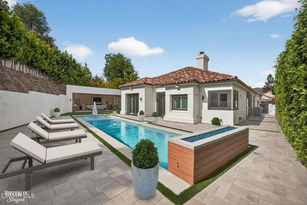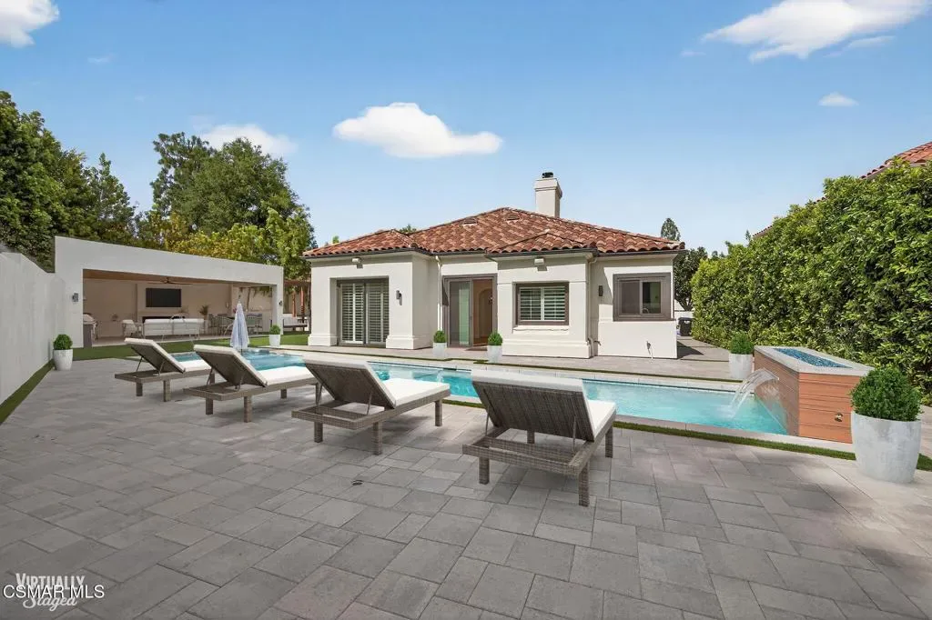 Single story Westlake Village home on a nearly 1/3 acre private corner lot. Exceptional outdoor rear yard. The backyard is truly a standout, featuring an outdoor living area with a built-in BBQ, pizza oven, sink, fireplace, and wired for a TV. Meticulously landscaped grounds with new hardscape throughout the exterior to create a setting rarely found in this price range. Fire feature added to the pool and spa. Other upgrades are a recently replaced roof with new Spanish tile, newer windows, brand new wood flooring throughout, shutters, a remodeled primary bath. Custom lighting is found throughout, along with in-wall speakers for TV and music both indoors and out. Added skylights bring in even more natural light.