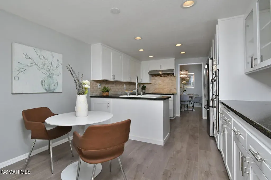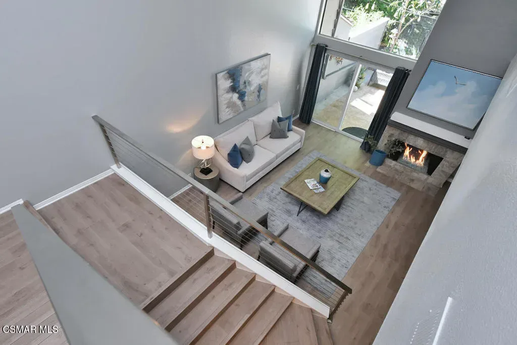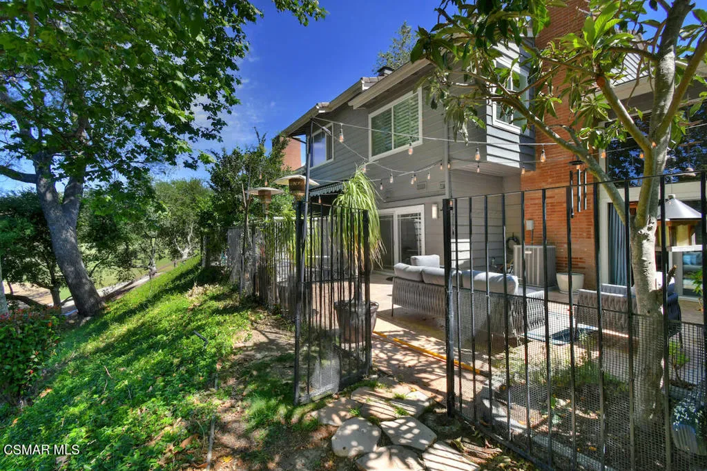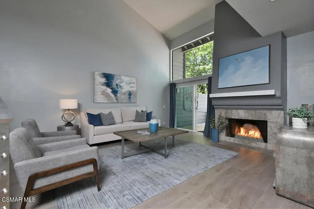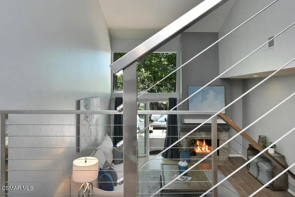This beautifully remodeled contemporary townhome sits in the heart of North Ranch, offering scenic fairway views of the North Ranch Country Club golf course and surrounded by exquisite multi-million dollar estates. Bright, open, and inviting, the home welcomes you with gleaming hardwood floors and a fresh, airy feel throughout. A modern staircase with sleek stainless steel and cable railings leads you upward, while soaring cathedral ceilings and a dramatic wall of glass with transom windows fill the space with natural light, all while maintaining a sense of privacy. The spacious living room features a stylish updated fireplace and flows effortlessly into the formal dining area, highlighted by a striking contemporary designer chandelier. The main level also includes a wet bar with Carrera marble countertops and a beautifully remodeled powder room. In the kitchen, you’ll find granite countertops, a subway stone tile backsplash, large cast iron sink and newer faucet, white cabinetry with stainless hardware, and a charming breakfast nook. Upstairs, the luxurious primary suite offers a spa-inspired bathroom with Carrera marble, a separate tub and shower, and a designer double vanity. Two additional generously sized bedrooms and an updated bathroom complete the second floor. Step outside to a large private patio and yard with sweeping golf course and canyon views–perfect for effortless indoor-outdoor living and entertaining.
