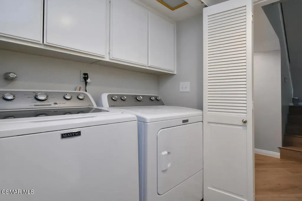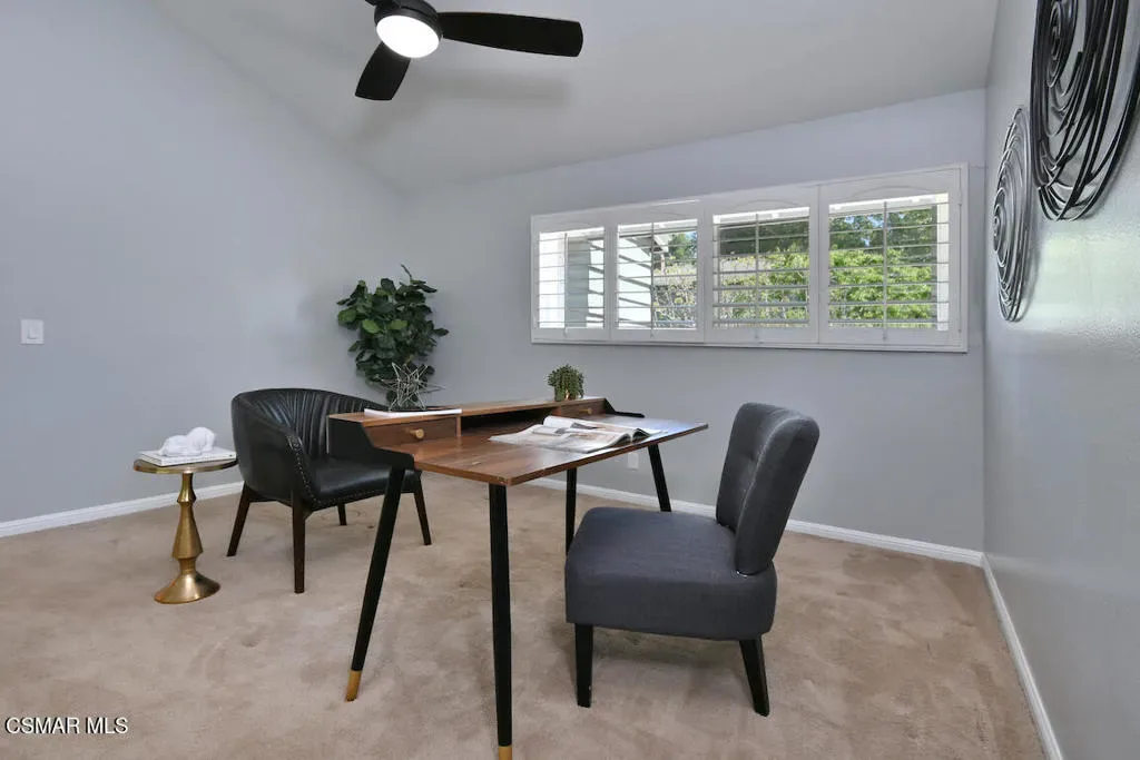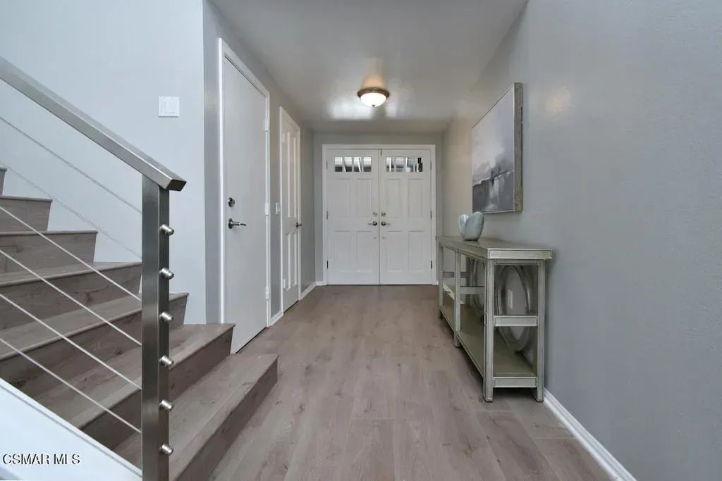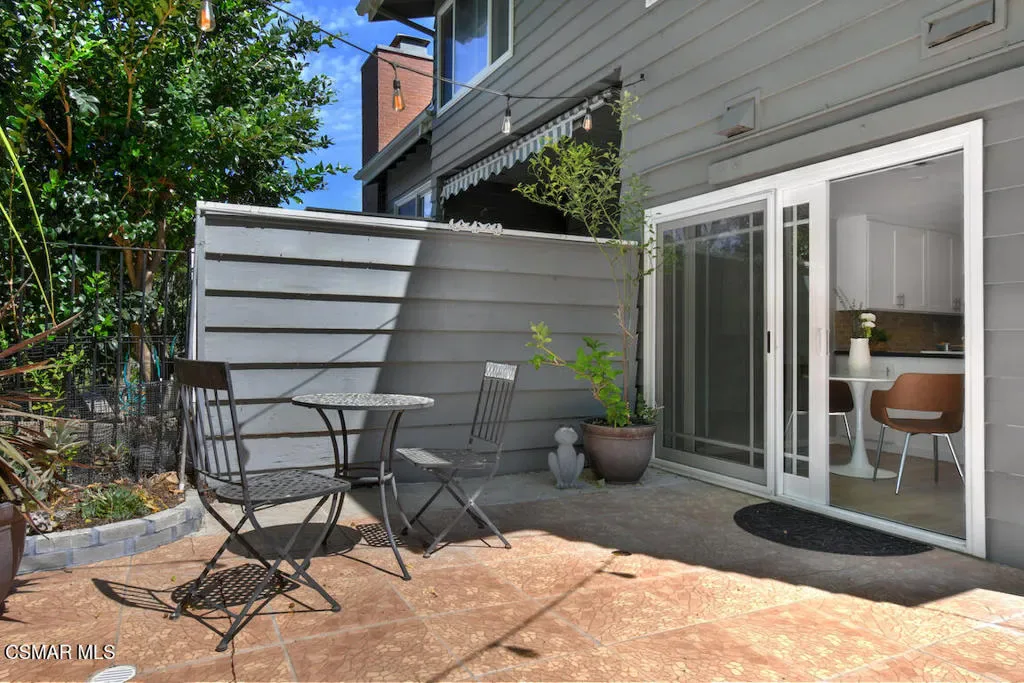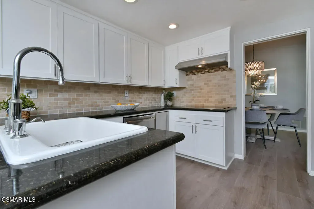 This beautifully remodeled contemporary townhome sits in the heart of North Ranch, offering scenic fairway views of the North Ranch Country Club golf course and surrounded by exquisite multi-million dollar estates. Bright, open, and inviting, the home welcomes you with gleaming hardwood floors and a fresh, airy feel throughout. A modern staircase with sleek stainless steel and cable railings leads you upward, while soaring cathedral ceilings and a dramatic wall of glass with transom windows fill the space with natural light, all while maintaining a sense of privacy. The spacious living room features a stylish updated fireplace and flows effortlessly into the formal dining area, highlighted by a striking contemporary designer chandelier. The main level also includes a wet bar with Carrera marble countertops and a beautifully remodeled powder room. In the kitchen, you’ll find granite countertops, a subway stone tile backsplash, large cast iron sink and newer faucet, white cabinetry with stainless hardware, and a charming breakfast nook. Upstairs, the luxurious primary suite offers a spa-inspired bathroom with Carrera marble, a separate tub and shower, and a designer double vanity. Two additional generously sized bedrooms and an updated bathroom complete the second floor. Step outside to a large private patio and yard with sweeping golf course and canyon views–perfect for effortless indoor-outdoor living and entertaining.