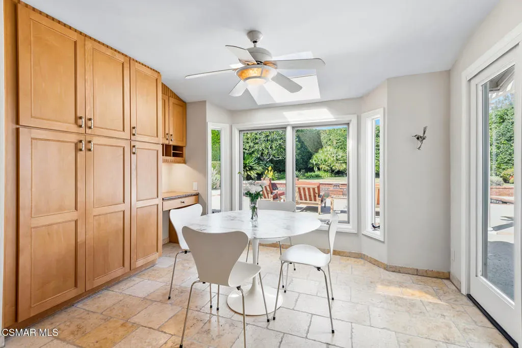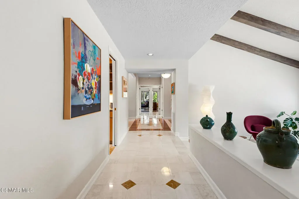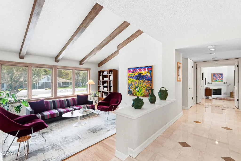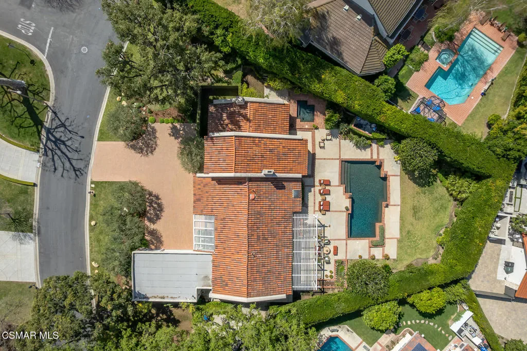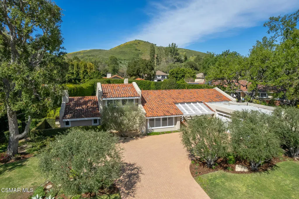 Welcome to 4011 Cresthaven Drive, a beautiful single-story California ranch estate set on a rare flat 0.48-acre lot in the heart of Westlake Village’s coveted North Ranch. With 3,371 square feet of thoughtfully designed living space, this four-bedroom plus loft residence offers an extraordinary blend of warmth, character, and resort-caliber outdoor living.A beautiful interlocking paver driveway framed by mature olive trees and a three-car garage make a quiet first impression — one that carries through the moment you step inside. Marble floors with inlaid detail, beamed ceilings, and an easy flow from the entry through the formal spaces set the stage for everything that follows.The formal living room at the front of the home is warm and inviting, with exposed wood beams and a wall of windows overlooking the manicured front grounds. The separate family room commands attention with soaring vaulted wood-beamed ceilings, a dramatic full-height brick fireplace, and direct access to the backyard. A dedicated dining room with a statement chandelier, windows, and garden views makes entertaining effortless.The chef’s kitchen features custom Schuler cabinetry with pull-out shelving, granite countertops and backsplash, a built-in refrigerator, double oven, and a central island with integrated wine storage. A sun-filled breakfast nook with direct patio access completes the space and makes it the perfect spot to start the day.The primary suite is its own private wing, offering vaulted beamed ceilings, a serene fireplace, dual closets, with direct access to the backyard. The primary ensuite bathroom features custom Schuler cabinetry and is thoughtfully appointed to match the quality found throughout the home. Three additional bedrooms occupy the opposite wing, served by a shared bathroom and a hallway bathroom convenient for guests. A versatile loft with stunning wood-plank and beam ceilings rounds out the home as an inspiring office or flex space.Wood Pella windows and sliding doors are found throughout.Step outside and discover what truly sets this property apart. The resort-style backyard is an entertainer’s dream, reminiscent of a Santa Barbara-inspired spa. A saltwater pebble-tec pool and separate spa anchor the outdoor space, surrounded by a thoughtfully designed brick and concrete patio with inlaid brick detail, a covered pergola ideal for al fresco dining, and lush mature landscaping including two lemon trees, a lime tree, and an orange tree. A mature privacy hedge encloses the entire rear yard, creating a sense of seclusion and privacy rarely found this close to everything Westlake Village has to offer.