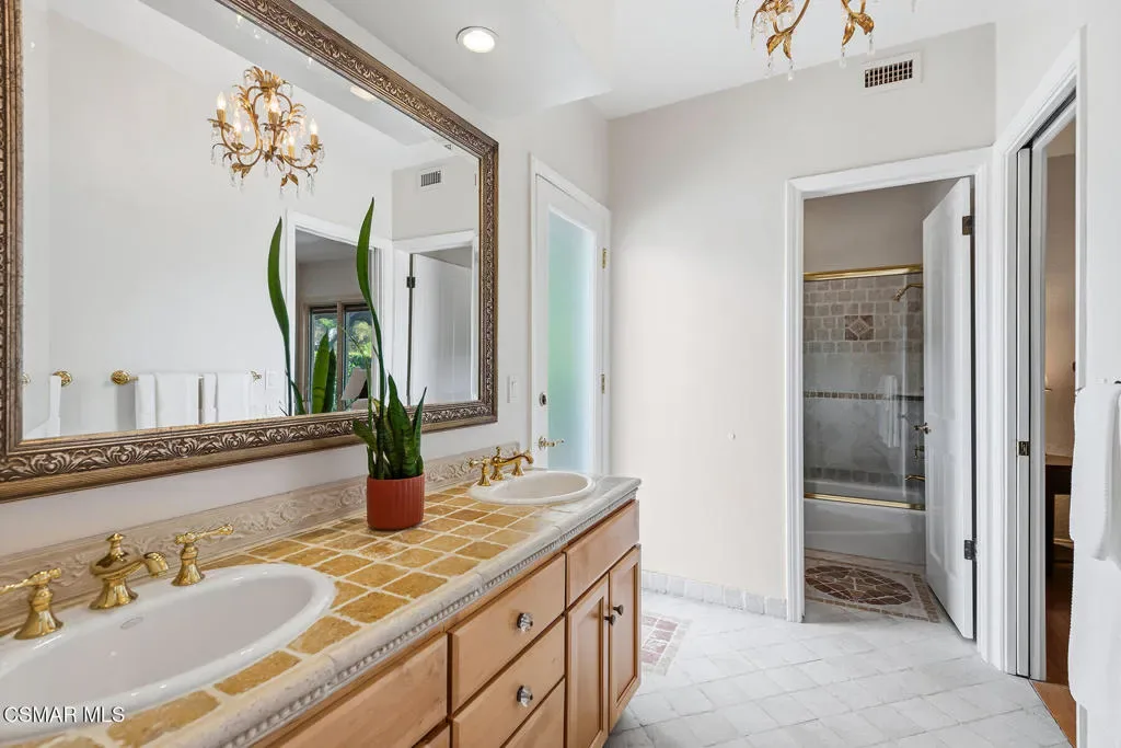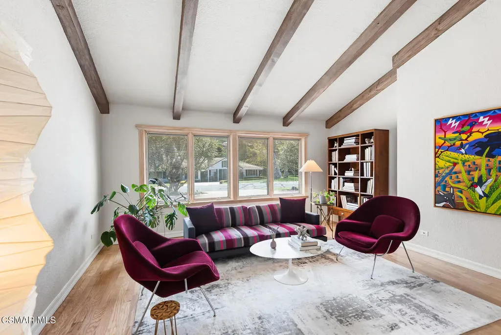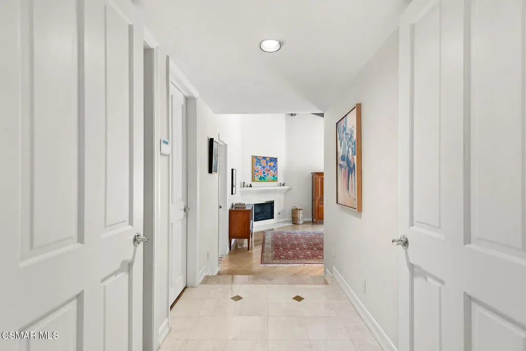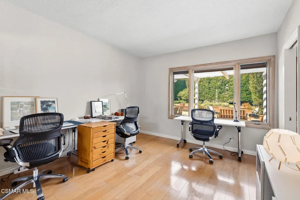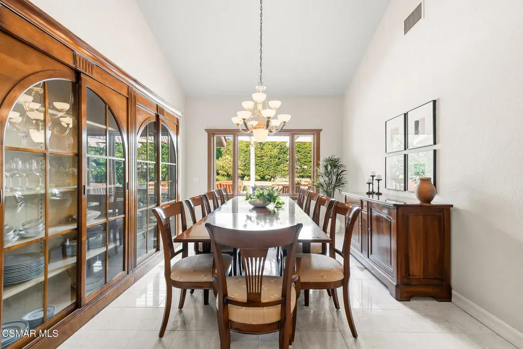 Welcome to 4011 Cresthaven Drive, a beautiful single-story California ranch estate set on a rare flat 0.48-acre lot in the heart of Westlake Village’s coveted North Ranch. With 3,371 square feet of thoughtfully designed living space, this four-bedroom plus loft residence offers an extraordinary blend of warmth, character, and resort-caliber outdoor living.A beautiful interlocking paver driveway framed by mature olive trees and a three-car garage make a quiet first impression — one that carries through the moment you step inside. Marble floors with inlaid detail, beamed ceilings, and an easy flow from the entry through the formal spaces set the stage for everything that follows.The formal living room at the front of the home is warm and inviting, with exposed wood beams and a wall of windows overlooking the manicured front grounds. The separate family room commands attention with soaring vaulted wood-beamed ceilings, a dramatic full-height brick fireplace, and direct access to the backyard. A dedicated dining room with a statement chandelier, windows, and garden views makes entertaining effortless.The chef’s kitchen features custom Schuler cabinetry with pull-out shelving, granite countertops and backsplash, a built-in refrigerator, double oven, and a central island with integrated wine storage. A sun-filled breakfast nook with direct patio access completes the space and makes it the perfect spot to start the day.The primary suite is its own private wing, offering vaulted beamed ceilings, a serene fireplace, dual closets, with direct access to the backyard. The primary ensuite bathroom features custom Schuler cabinetry and is thoughtfully appointed to match the quality found throughout the home. Three additional bedrooms occupy the opposite wing, served by a shared bathroom and a hallway bathroom convenient for guests. A versatile loft with stunning wood-plank and beam ceilings rounds out the home as an inspiring office or flex space.Wood Pella windows and sliding doors are found throughout.Step outside and discover what truly sets this property apart. The resort-style backyard is an entertainer’s dream, reminiscent of a Santa Barbara-inspired spa. A saltwater pebble-tec pool and separate spa anchor the outdoor space, surrounded by a thoughtfully designed brick and concrete patio with inlaid brick detail, a covered pergola ideal for al fresco dining, and lush mature landscaping including two lemon trees, a lime tree, and an orange tree. A mature privacy hedge encloses the entire rear yard, creating a sense of seclusion and privacy rarely found this close to everything Westlake Village has to offer.