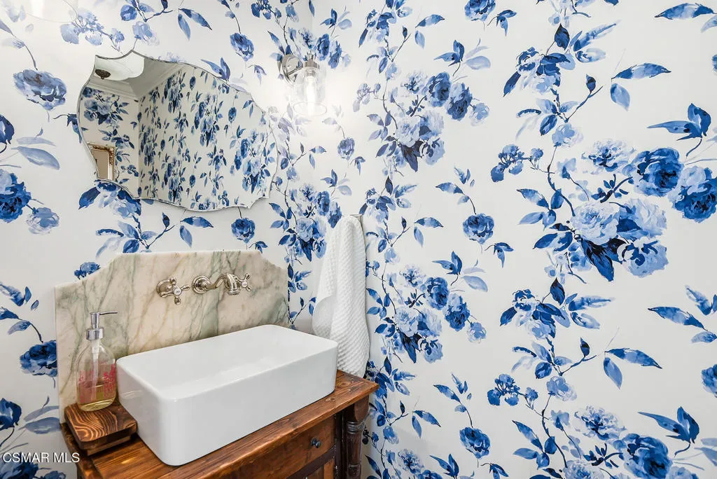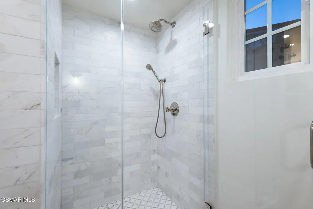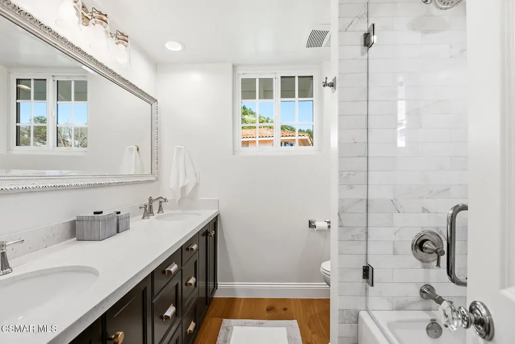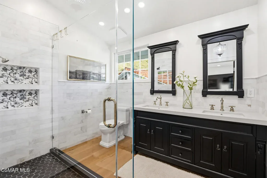 TURN-KEY, FULLY RENOVATED HOME IN WESTLAKE VILLAGE. Beautifully reimagined home with an emphasis on craftsmanship and timeless materials, this comprehensively renovated 4 bedroom, 3.5 bath residence blends classic architecture with modern living. Nine-inch engineered hardwood floors run throughout the home, complemented by high ceilings, refurbished beams, raised upstairs ceilings, and Level 4 smooth walls and ceilings that create a clean architectural backdrop. Crown molding, custom door casings, and a custom white oak bannister add refined millwork detail, while Arhaus lighting, Emtek polished nickel hardware, recessed LED lighting, and custom vent covers complete the interior.The kitchen has been completely reimagined with a permitted structural wall removal creating open flow around a striking 7.5-foot leathered quartzite island with seating for four. Custom inset cabinetry with soft-close drawers and integrated organizers is paired with Caesarstone countertops, a Shaws farmhouse sink, Graff polished nickel fixtures, and integrated GE Monogram appliances alongside a Dacor six-burner range with double ovens and warming drawer.All bathrooms have been fully renovated with marble tile, furniture-style vanities, Caesarstone surfaces, and polished nickel finishes. A custom-designed powder room serves as a standout design feature with a vintage vanity, quartzite backsplash, Anthropologie lighting, designer wallpaper, and a concealed hidden door. A custom laundry room offers built-in cabinetry, designer tile, and an integrated laundry chute.The exterior has been refreshed with smooth stucco finishes, newly designed landscaping, and paver pathways connecting multiple outdoor seating areas, along with a private courtyard patio and outdoor shower.Additional improvements include a finished garage with smoothed walls, epoxy flooring, new Clopay garage doors, new water heater, and an upgraded electrical panel ready for EV charging.Located within the attendance boundaries of Westlake Elementary School, Colina Middle School, and Westlake High School.