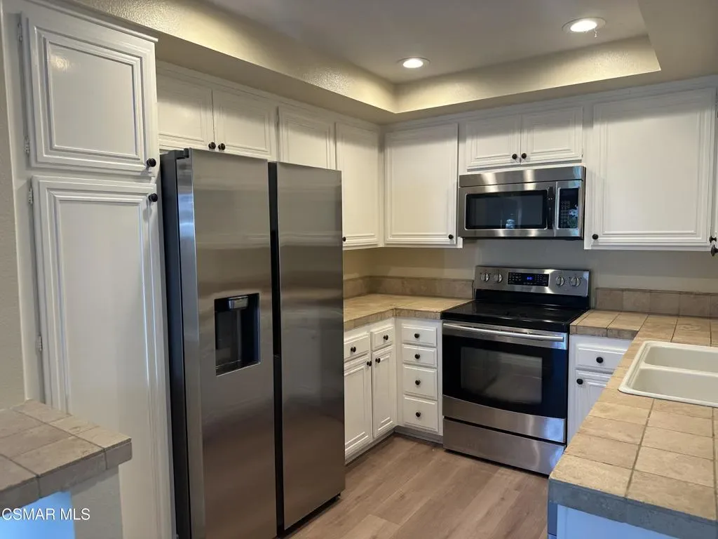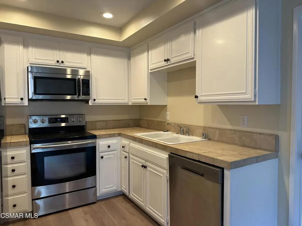 Light-n-bright 2 BD + 1.5 BA townhome ideally located in the picturesque Summershore community, adjacent to the Westlake Lake, The Landing restaurants & shops, and hiking trails. Ceramic stone tile entry, NEW laminate floors downstairs, recessed lighting, smooth ceilings, neutral paint. Neutral carpet on 2nd floor. This remodeled unit has a beautiful kitchen with stone tile counters, freshly-painted white cabinets, stainless steel refrigerator, range, & microwave. The dining area has 2 sets of sliding doors that open to a private patio. The large living room features a gas fireplace. The bathrooms are complete with custom vanities with new hardware, updated fixtures, and newer flooring. The primary bedroom features a charming balcony, mirrored closet doors, and recessed lighting. Second bedroom is also flooded with natural light. 2-car immaculate, attached garage. Rent includes water and trash services. Community pool & spa and greenbelts which lead to a charming waterfall and stream!