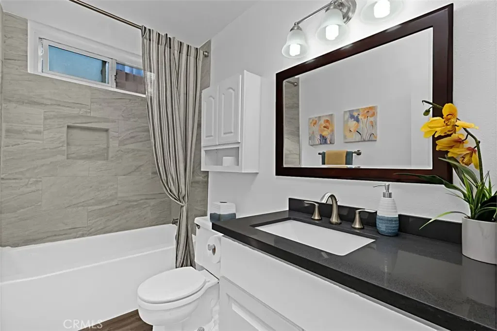Relax in the spacious primary suite, complete with a walk-in closet and beautifully updated en-suite bath. The secondary bedroom offers versatility with built-in wall shelves, ideal for a home office or guest space. Both bathrooms feature stylish finishes and quartz countertops for a cohesive, modern feel.