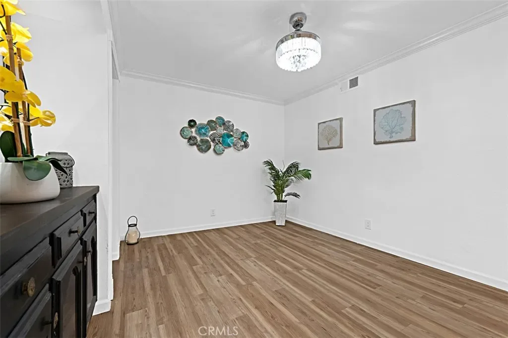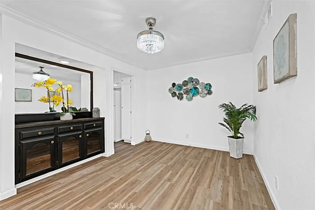 The stunning kitchen is designed to impress, showcasing sleek quartz countertops, modern cabinetry, pantry, and a new stove with an included refrigerator—perfect for creating your favorite culinary delights. The adjacent dining area features a charming built-in sideboard with mirror and glass cabinets, adding both elegance and extra storage.
