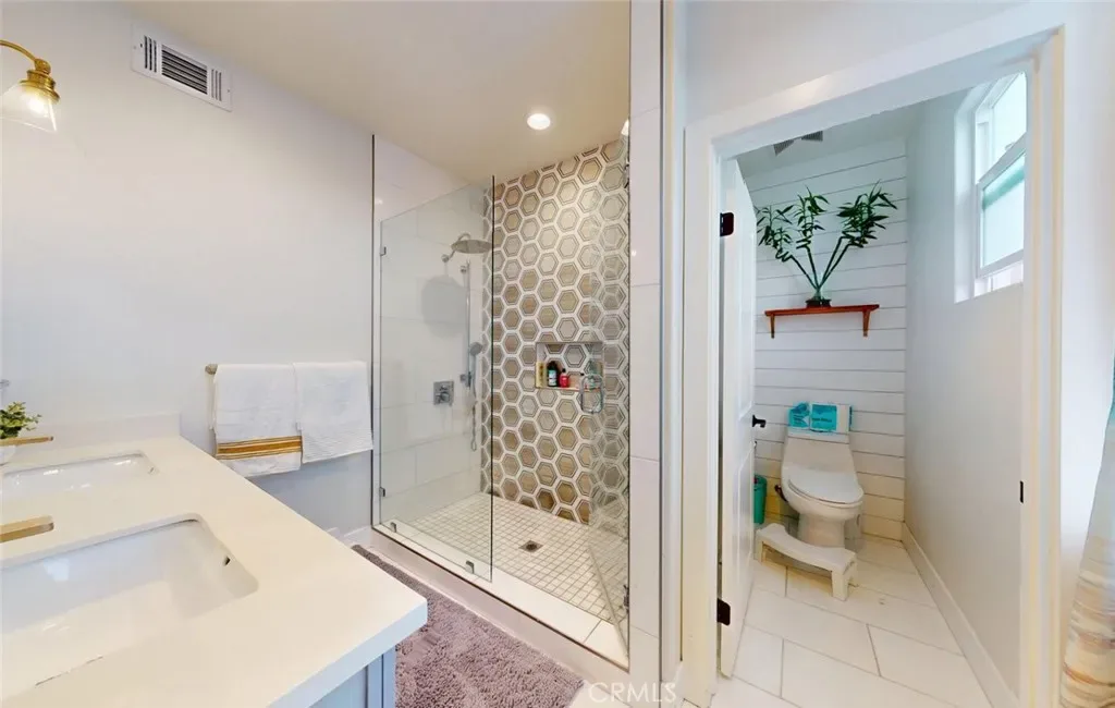 Upstairs, the sun-filled primary suite features a large closet and a spacious en-suite bathroom with dual sinks. Two additional bedrooms and a full bath provide flexibility for family, guests, or a home office.