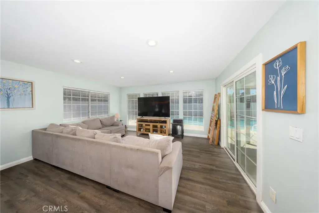 The main home showcases an open-concept floor plan filled with natural light from four large windows that overlook the backyard oasis.