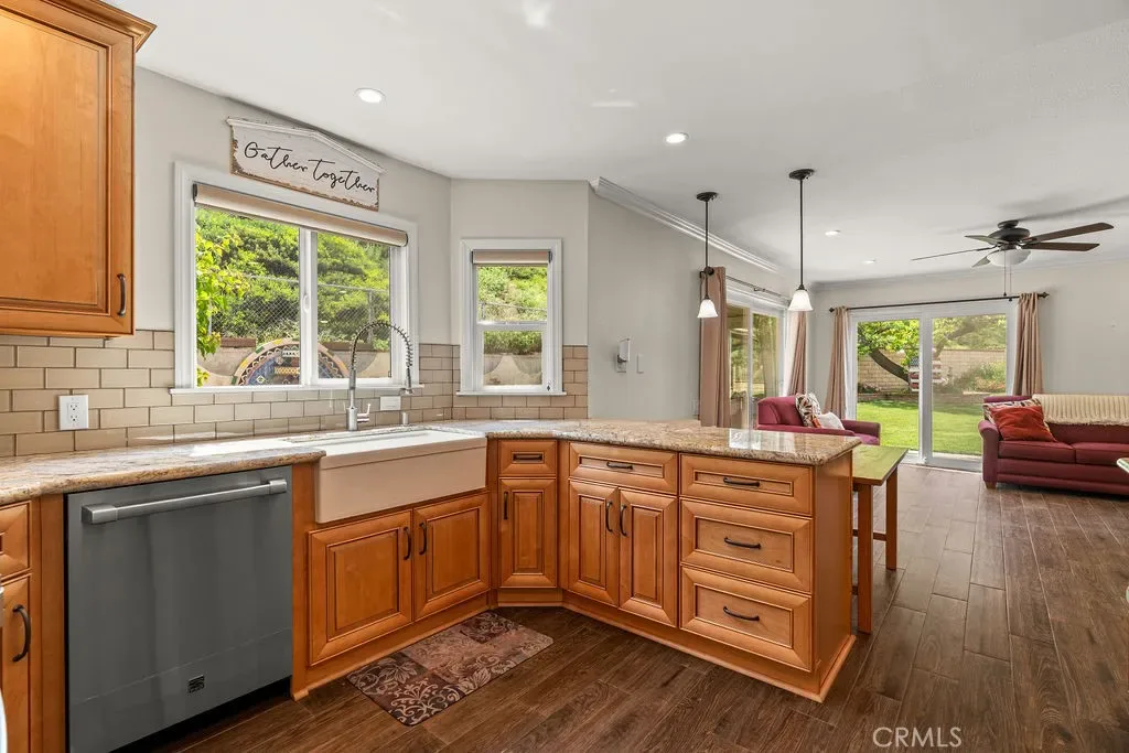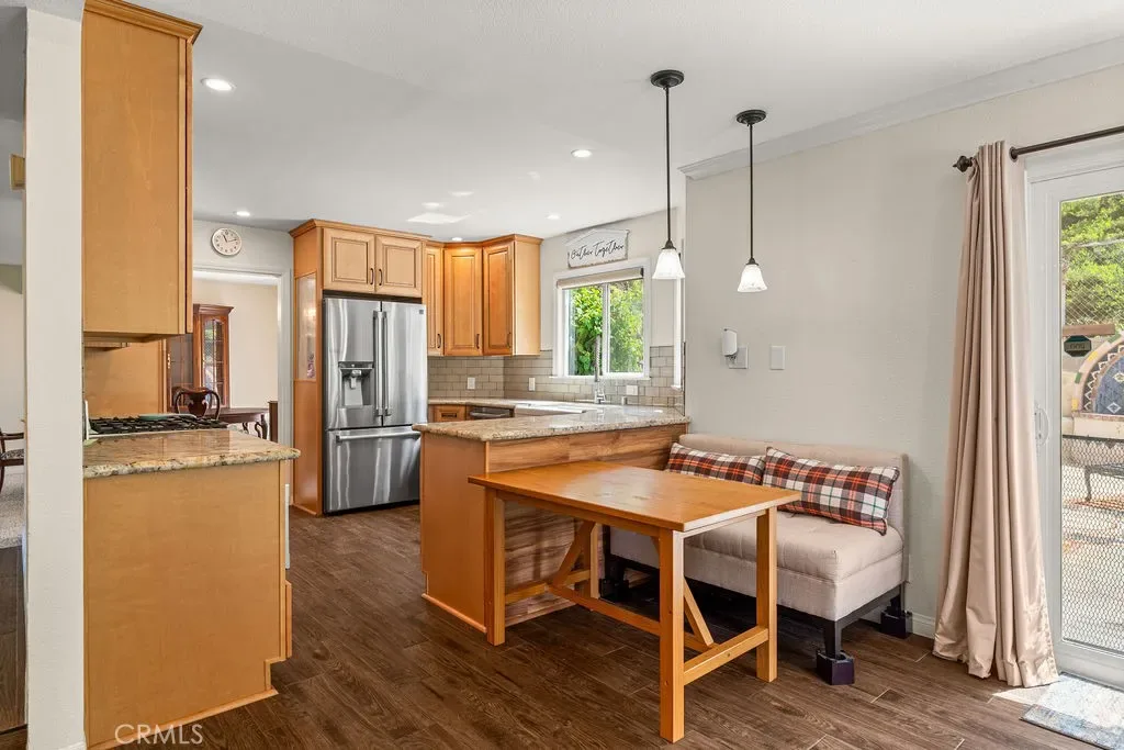 The thoughtfully updated kitchen features granite countertops, farm house sink, stainless steel appliances, upgraded cabinetry, and opens seamlessly to a view towards the backyard through the sliding doors —creating an ideal layout for both everyday living and entertaining. The main level flows effortlessly between the kitchen, dining, living, and family areas, making gatherings easy and enjoyable.