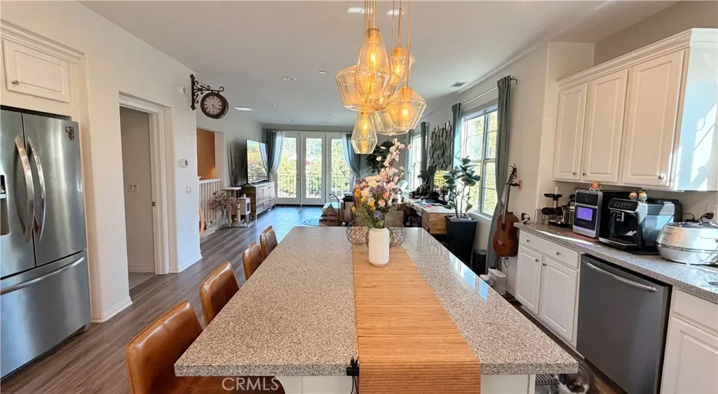 The entry level welcomes you with a dedicated foyer and storage that keeps everyday life organized from the moment you walk in. The open second floor connects kitchen, dining, and living in one warm light-filled space anchored by wood flooring, a statement kitchen island, and designer multi-light pendant fixtures. The layout flows naturally and feels made for both quiet evenings and real entertaining.