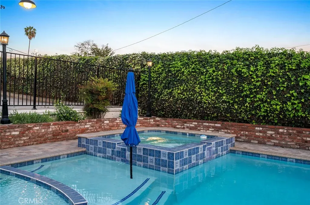 The resort-style backyard is where this property truly sets itself apart. The custom pool features an integrated wading pool with a kids’ fountain, and a 12-man spa — all surrounded by mature privacy hedging, and an upper entertaining patio shaded by a black and white striped awning with a cast iron bistro set overlooking the pool below. Handcrafted French Quarter iron lamp posts and bougainvillea in full bloom complete a backyard that functions like a private venue. Outdoor furniture included.