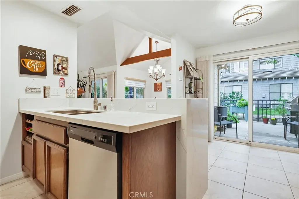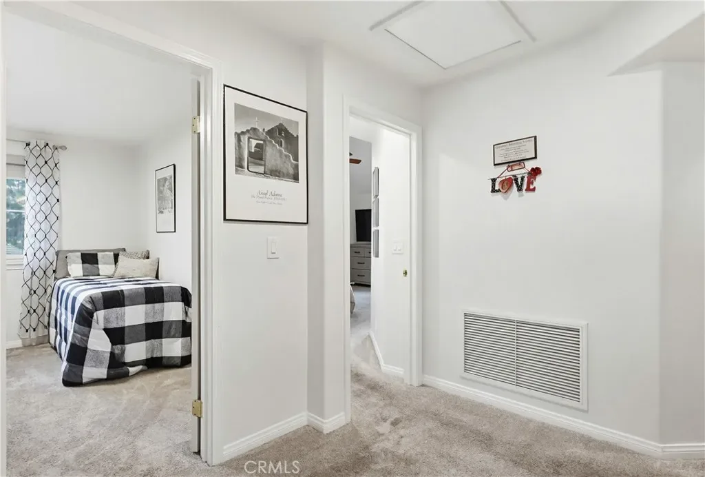 The updated kitchen includes quartz countertops, stainless steel appliances, tile flooring, and custom window coverings. Warm wood flooring runs through the main living areas, with soft carpet in the bedrooms for comfort.