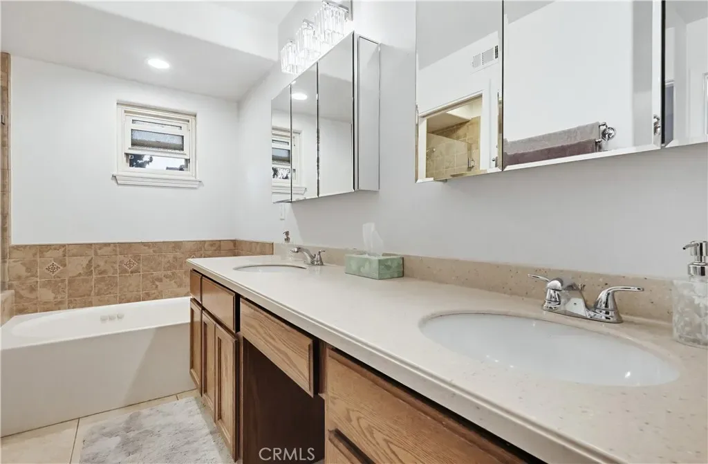 The spacious primary suite offers a Jacuzzi soaking tub and separate walk-in shower, creating a relaxing retreat. A second full bathroom provides flexibility for guests or family.