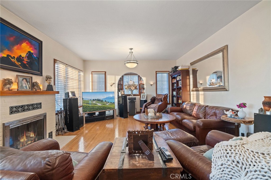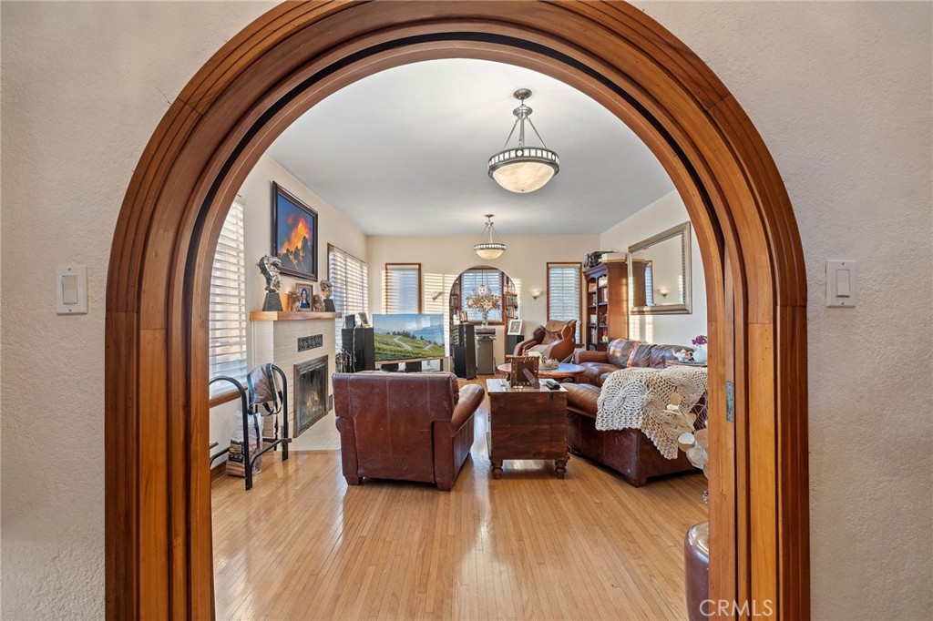 Inside, the living room welcomes you with an arched doorway, beautiful hardwood pocket doors, high ceilings, a standout fireplace, and hardwood floors. An adjacent seating area—through another set of wood pocket doors—provides a perfect space for hosting guests before a formal dining room that’s sized for large gatherings.