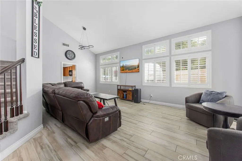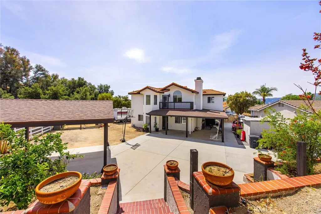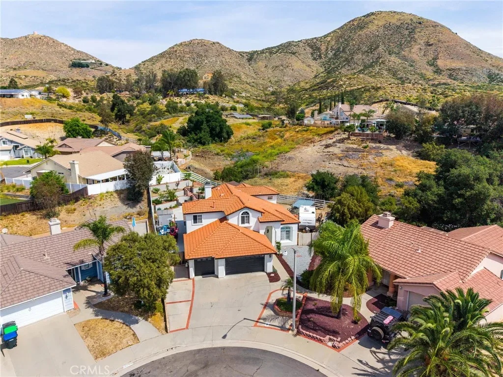Two-story home situated on a cul-de-sac in Wildomar. The property features a functional floor plan with multiple living areas and natural light throughout. The kitchen includes ample cabinetry and counter space and connects to the main living area. Upstairs bedrooms include a primary suite with a private bathroom and a walk-in closet. The backyard provides space for outdoor use. Located near parks, schools, shopping, and with access to nearby freeways.
