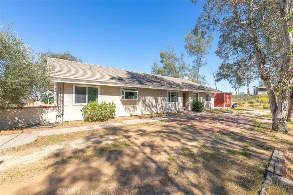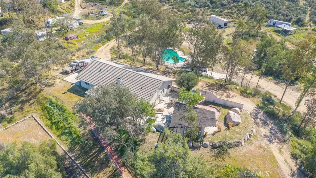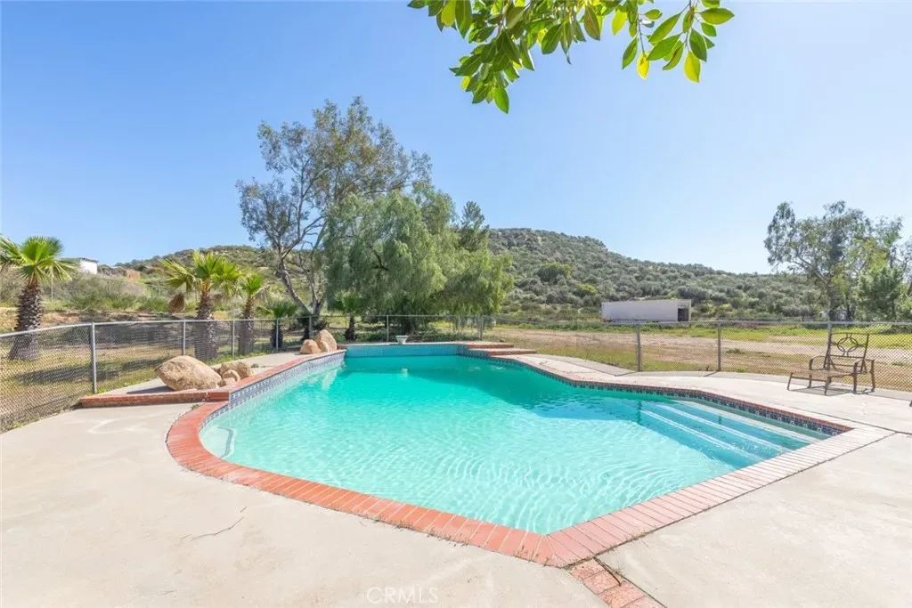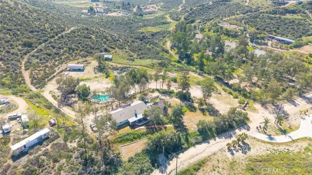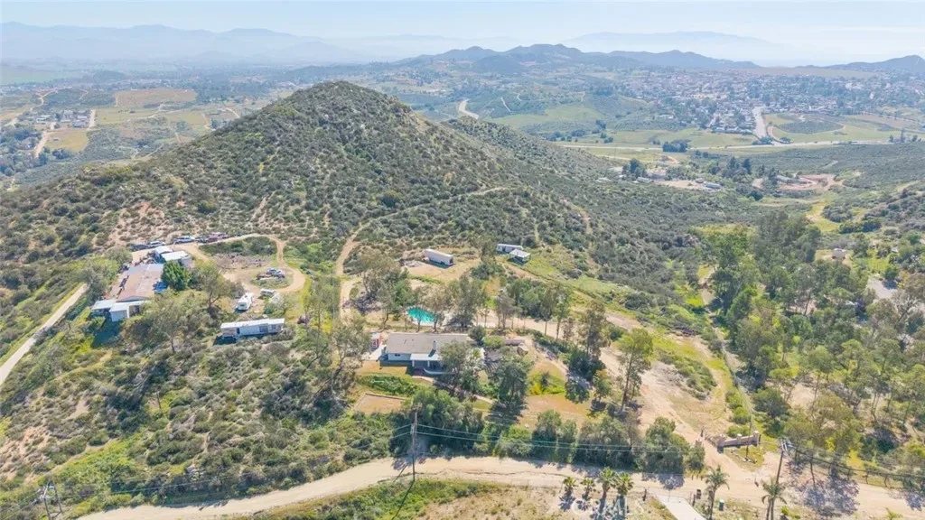 Welcome home to this stunning single-story ranch-style POOL home featuring 3 bedrooms plus an office/den (easily converted to a 4th bedroom), 2 full bathrooms, and located on an incredible 6.46 acres which are usable and secluded. This property has with LOW TAXES and NO HOA. Offering breathtaking 180-DEGREE PANORAMIC VALLEY VIEWS that provides the perfect balance of privacy, space, and convenience—ideal for RVs, toys, horses, or future expansion. Inside, the home showcases gorgeous porcelain tile flooring throughout, new baseboards, all new door casings, new interior and exterior doors and a thoughtfully designed layout that includes a formal living room, formal dining area, and an impressive chef’s kitchen. The kitchen features custom built-in cabinetry, granite countertops, bar seating, a cooktop with vented hood, stainless steel appliances, decorative tile backsplash, wine cooler, and a charming bay-window sitting area perfectly positioned to capture the sweeping views. The spacious family room offers vaulted ceilings, a cozy fireplace, and abundant natural light, creating an inviting space for everyday living and entertaining. Recent upgrades include newer vinyl windows and sliding doors throughout, along with a new AC system. The primary suite is large and private, featuring vaulted ceilings, a walk-in closet, sliding door access to the outdoors, and a beautifully updated bathroom with a custom walk-in shower. Two additional bedrooms are generous in size and share a remodeled hallway bathroom with dual sinks, a tub/shower combo, and ample storage. Additional highlights include a large indoor laundry room with cabinetry and potential exterior access, making it ideal as a mudroom. Outdoors, enjoy multiple patio areas, a fire pit for crisp evenings, and endless opportunities to relax while taking in the expansive valley views. The property offers miles of scenic riding trails, extensive usable land suitable for an equestrian setup or boarding facility, and most of the acreage is fenced. An additional graded pad outside the fenced area provides an excellent opportunity for a future ADU. Located close to shopping, businesses, schools, restaurants, and the 15 & 215 freeways, this property offers the rare combination of being near everything while still feeling far removed from the hustle and bustle of city life. This is truly country living at its finest—don’t miss this exceptional opportunity.