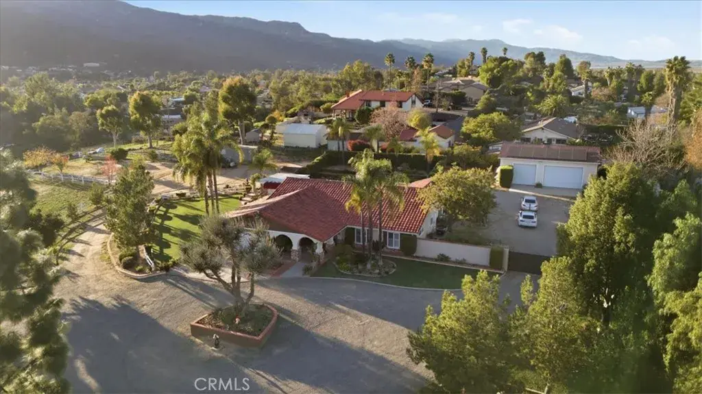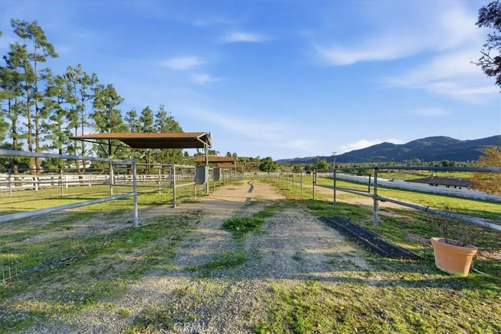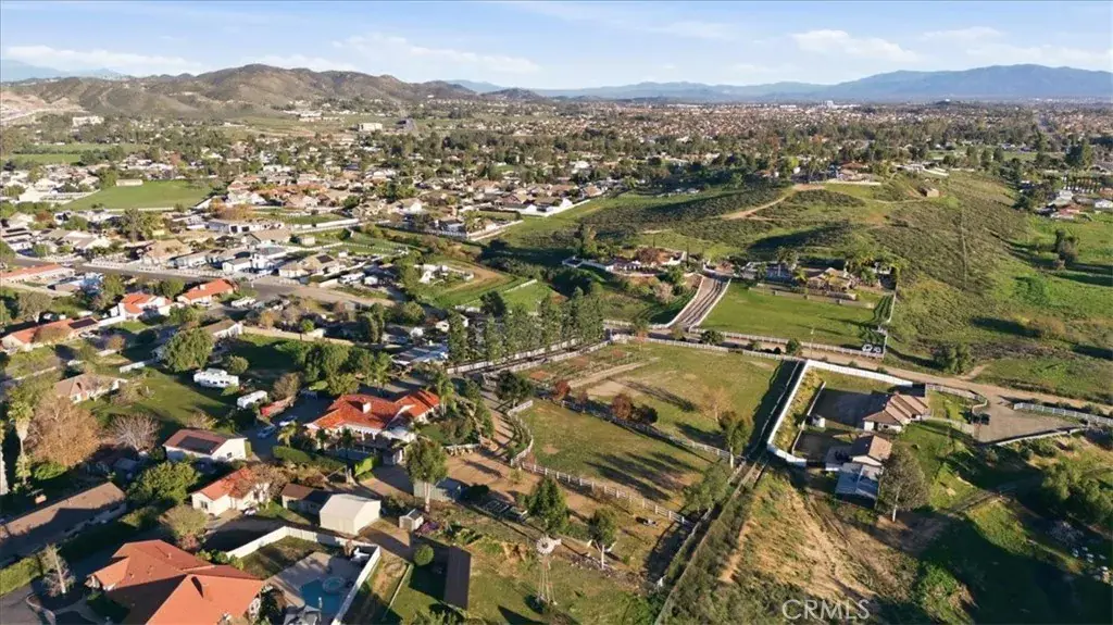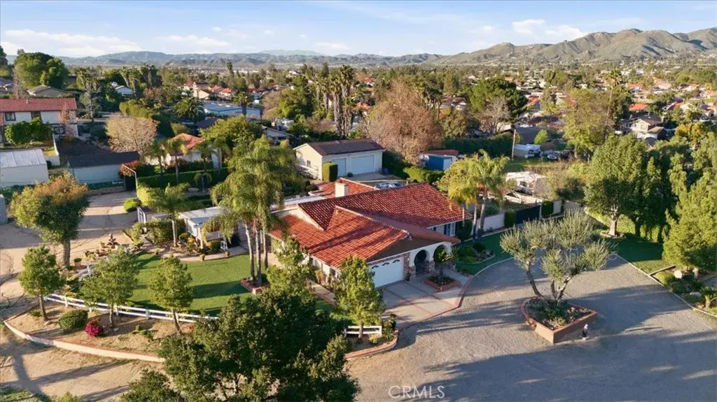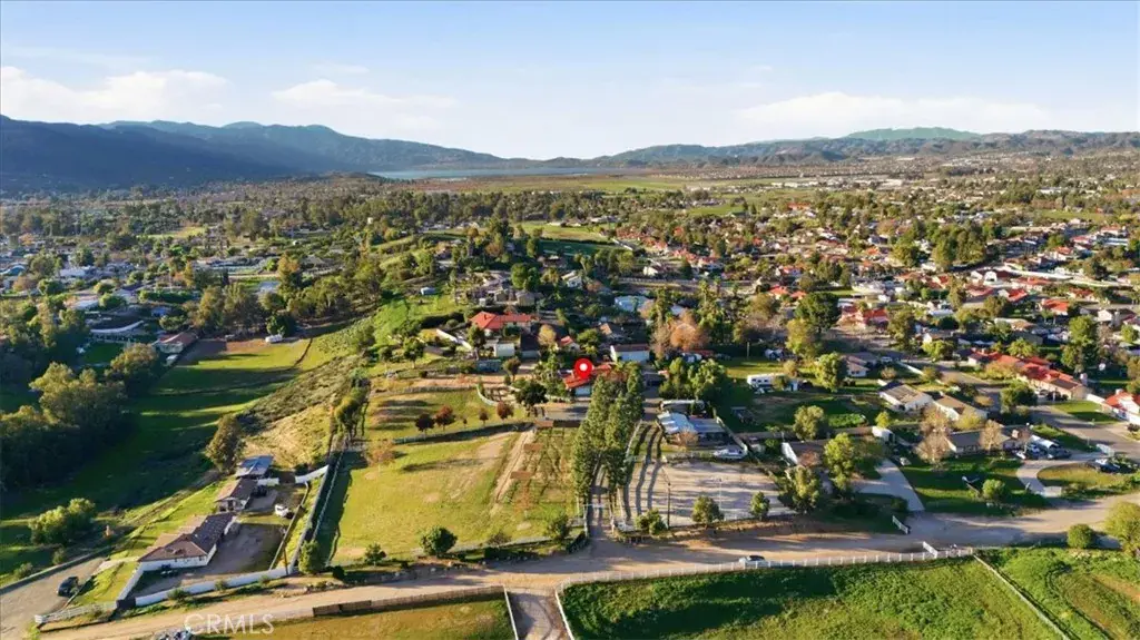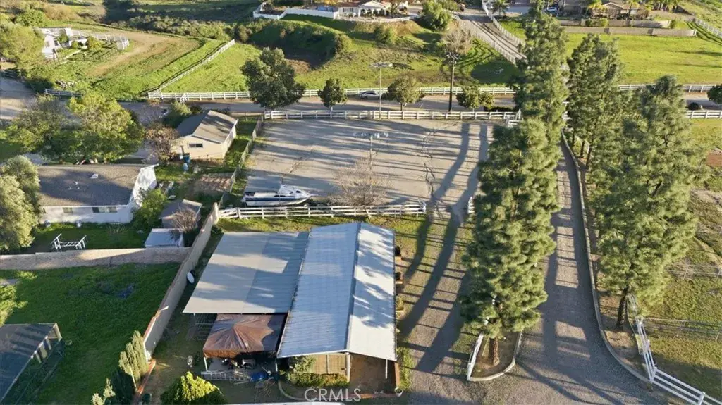 Perched atop a private hill with breathtaking views overlooking the Wildomar Valley, “Diamond K Ranch” makes a grand first impression with a private road and long, tree-lined driveway leading to the residence. Offered for the first time since 1989, this rare property includes an additional parcel totaling just over 3.5 acres of exceptional privacy and is fully equipped for a working ranch, featuring a 2,611 sq ft home with 4 bedrooms, 2 bathrooms, and an attached 2-car garage with stunning views from nearly every room. The meticulously maintained grounds showcase low-maintenance turf, an in-ground Pebble Tec pool, a gazebo with spa, garden beds, two large pastures, six fully fenced paddocks with shelter covers, four horse stalls with tack and feed room, a concrete wash stall, and a well-lit riding arena ideal for nighttime use. The home offers a spacious kitchen, wet bar, formal living and dining rooms, an easy-access circular driveway, and access to a detached 25×40 workshop/garage with high-clearance roll-up doors and power, while leased solar enhances energy efficiency. Fully fenced and secured behind an automatic gated entry, Diamond K Ranch offers privacy, peace of mind, ample space for RVs, trailers, and equipment, breathtaking panoramic views—including the chance to watch skydivers drift across the sky—and the rare convenience of country living just minutes from city amenities.
