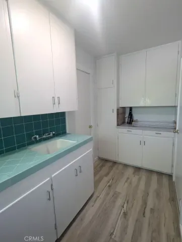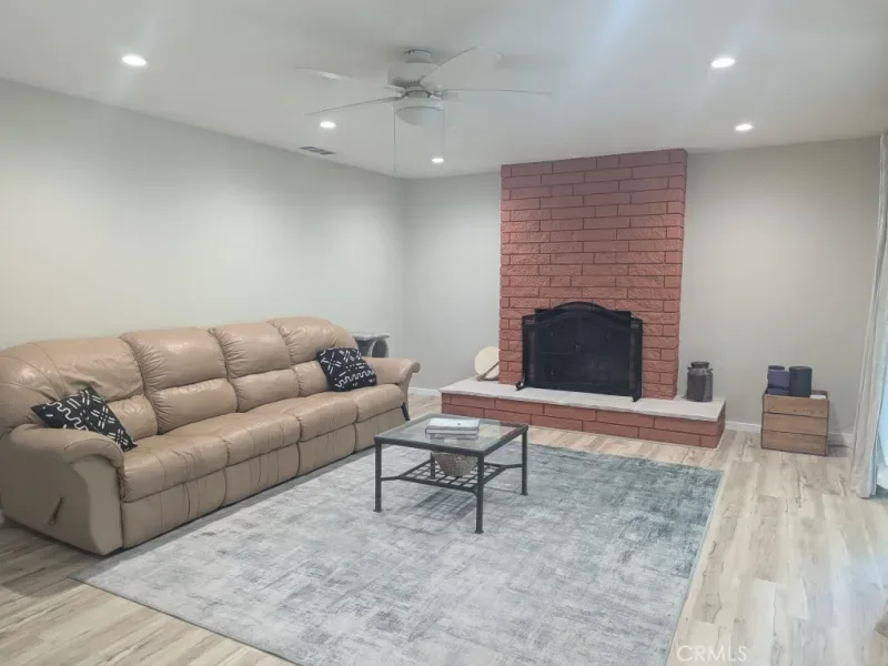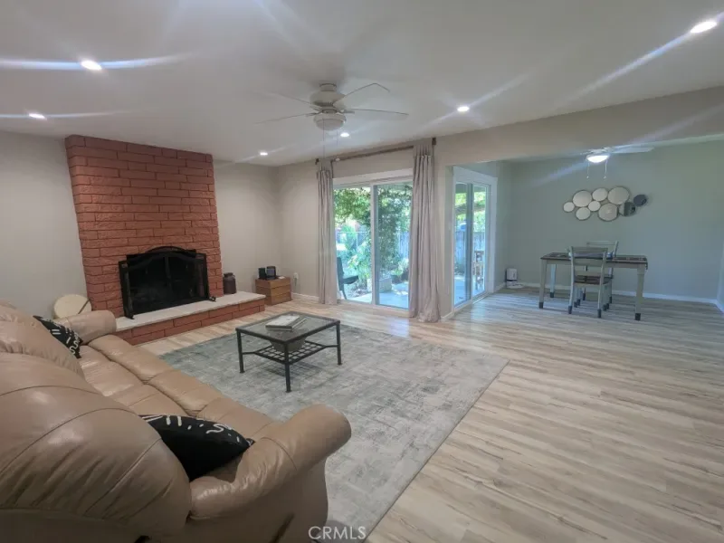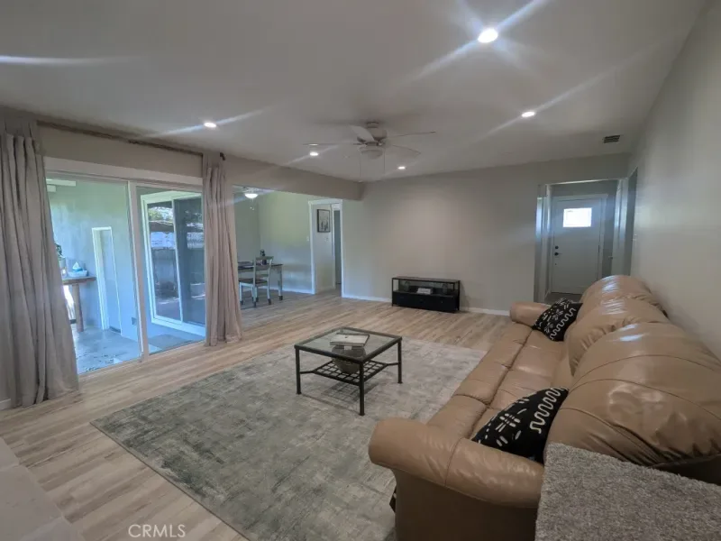 The expansive living area features a seamless flow between the living and dining rooms, highlighted by LVP flooring and new sliding glass doors that open to a covered rear patio—perfect for entertaining or relaxing outdoors. The kitchen offers ample cabinet space, a built-in desk/coffee bar, and practical storage options. The primary bedroom is generously sized, easily accommodating a king-size bed with plenty of room to spare. The versatile second bedroom can serve as a guest room, office, or craft space.