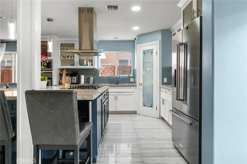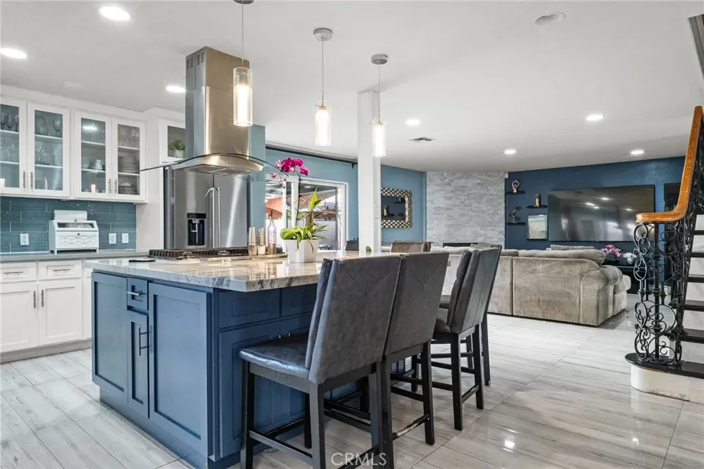 Step inside to find ceramic flooring throughout the main level, complemented by crown molding and recessed lighting that add warmth and elegance. The open-concept layout seamlessly connects the living area to a stylish kitchen featuring marble countertops, a large center island, pendant lighting, and a walk-in pantry perfect for both everyday living and entertaining. An updated fireplace creates a cozy focal point in the living space.